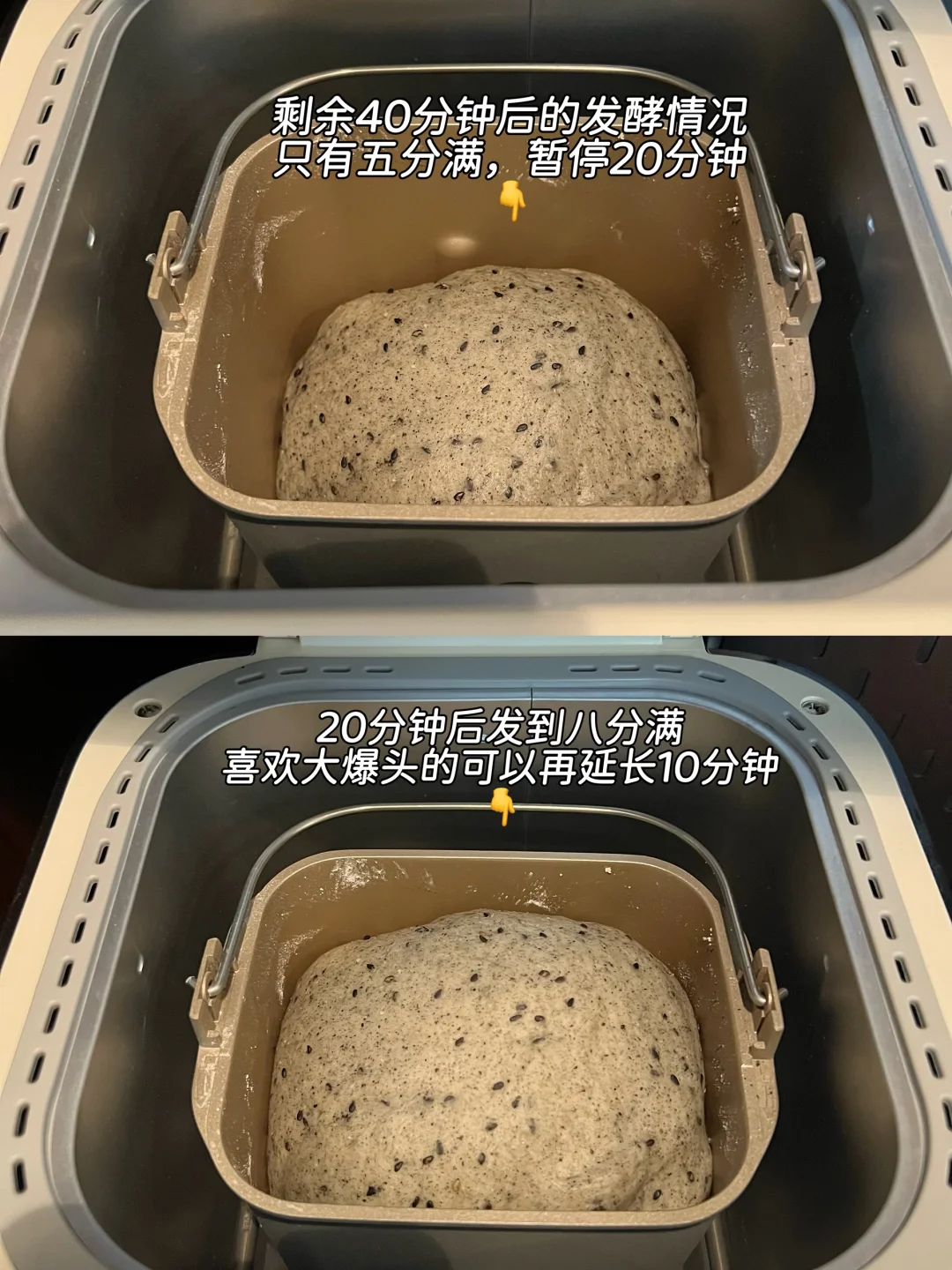 2️⃣剩余40分钟的时候按暂停看一下发酵的状况,如果没有到八九风满可以按暂停键,再发酵20分钟达到八九分满再开始烘烤