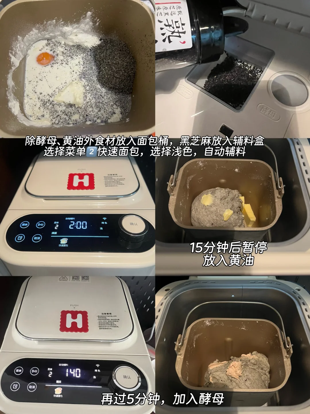 1️⃣ 除酵母、黄油外食材放入面包桶,黑芝麻放入辅料盒,选择海氏面包机菜单2️⃣快速面包,选择浅色,自动辅料