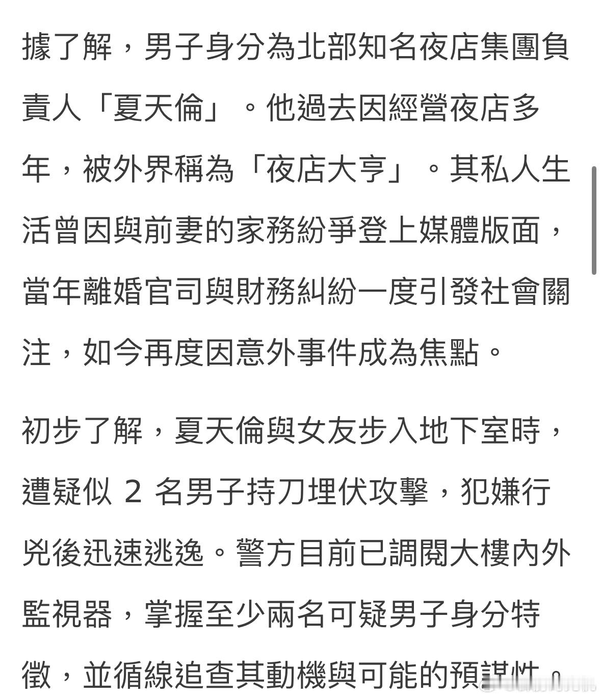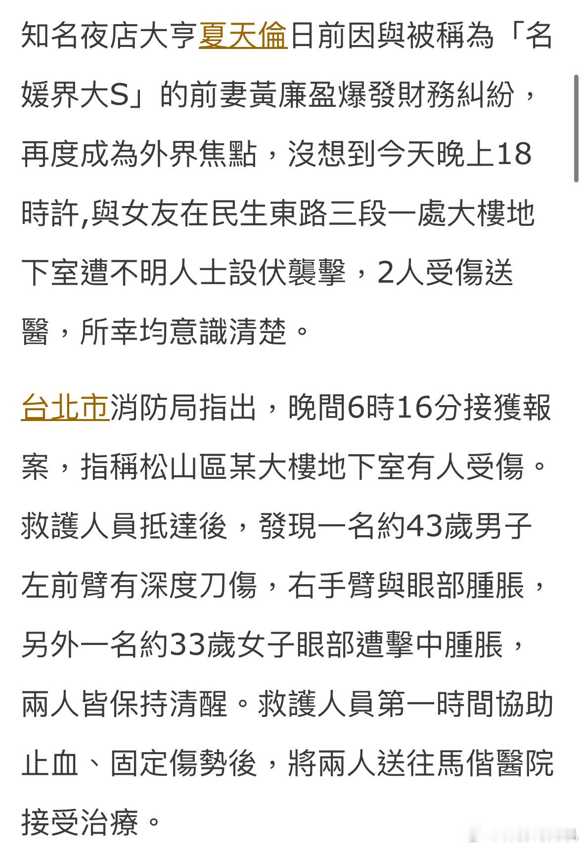插播一则社会新闻,台湾省夜店大亨遭砍,与女友均受伤送医