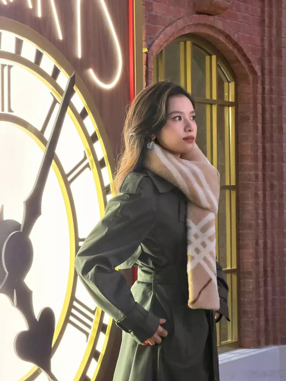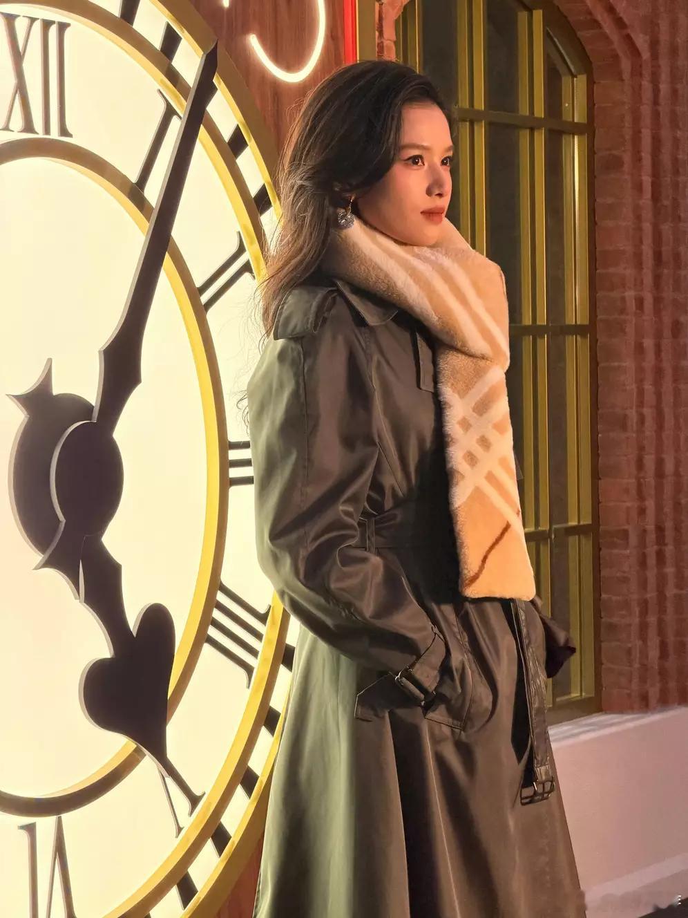 青青娱乐张婧仪穿灰色大衣配格纹围巾,站在钟表前美丽大方