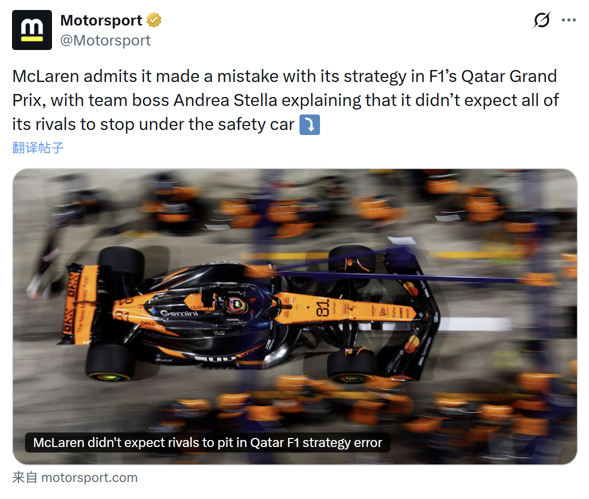 迈凯伦车队领队斯特拉在赛后解释他们犯下的策略失误。斯特拉说:“我们没预料到其他每个人都会进站。显然,如果后面所有车都进站,那么选择进站绝对是正确的决定。”“作为领跑车手时,你无法准确预判其他人的动向。如果我们让两辆赛车执行双车同圈进站,兰多可能会有所损失。但根本原因还是在于没有预见到其他人都会进站。这是个决策,但事实证明这是个错误决策。”“这绝对不是我们想要的结果,需要复盘总结。一如既往,我们会从比赛中吸取经验,在下一站变得更强——显然下一站现在已成为决定性战役,甚至更加重要。”F12025F1卡塔尔大奖赛