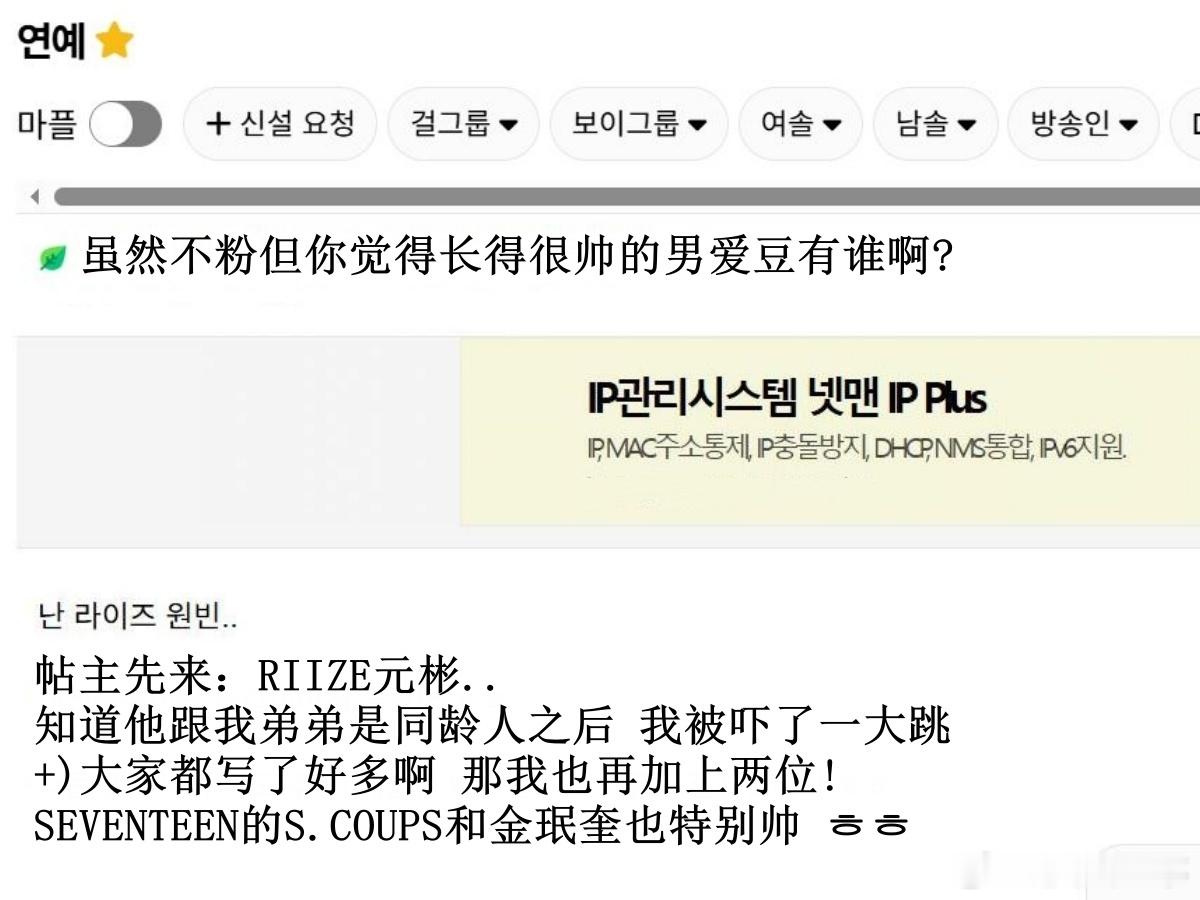 🔥韩网热帖评论翻译🔥虽然不粉但你觉得长得很帅的男爱豆有谁啊?韩网原帖帖主发问:虽然不粉但你觉得长得很帅的男爱豆有谁啊? 帖主先来:RIIZE朴元彬...知道他跟我弟弟是同龄人之后 我被吓了一大跳 +)大家都写了好多啊 那我也再加上两位! SEVENTEEN的S.COUPS和金珉奎也特别帅 ㅎㅎcr.instiz