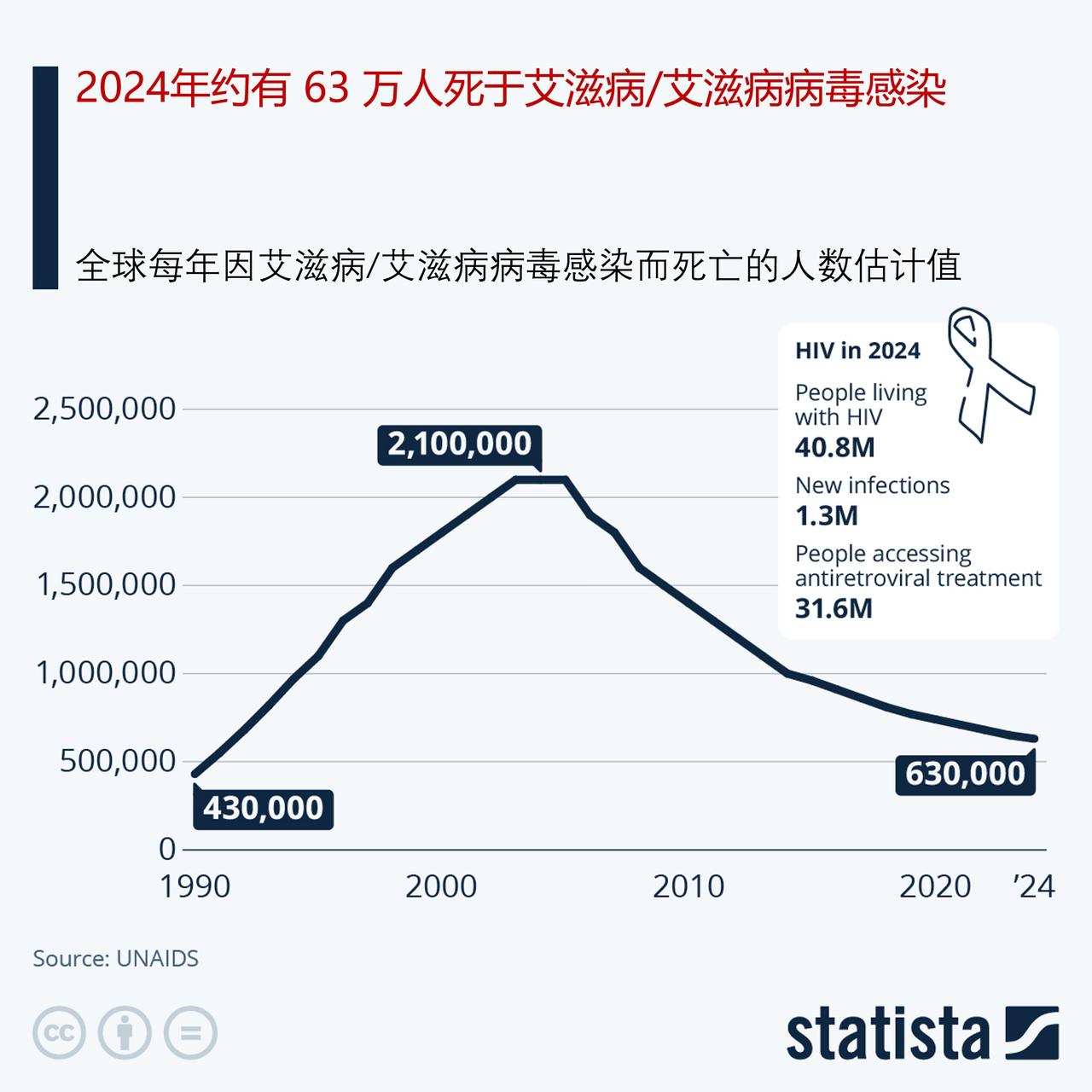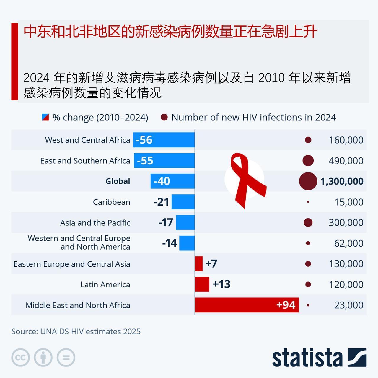 去年约有 63 万人死于艾滋病/艾滋病病毒感染,中东和北非地区的新感染病例数量正在急剧上升 尽管自 1988 年以来,12 月 1 日的世界艾滋病日一直被用于提高人们对这种疾病的认识,并悼念因该疾病而去世的人,但全球的艾滋病疫情远未结束。在 2024 年,全球约有 63 万人死于与艾滋病相关的疾病。虽然这与 2005 年艾滋病死亡人数的峰值相比差距很大,但要战胜这种疾病仍有很长的路要走。 当仔细研究这些数据时,不难发现不同地区在死亡人数方面存在巨大差异。2024 年,东非和南部非洲地区因艾滋病相关原因死亡的人数高达 26 万人(较 2010 年减少了 59%)。死亡人数排名第二的地区是亚洲和太平洋地区,为 15 万人(减少了 53%),其次是西非和中非地区,为 12 万人(减少了 60%),东欧和中亚地区为 4.8 万人(增长了 48%),拉丁美洲为 2.7 万人(减少了 31%)。2024年,西欧和中欧以及北非地区因艾滋病相关原因死亡的人数为 9000 人(减少了 48%),中东和北非地区为 7000 人(减少了 6%),加勒比地区为 4800 人(减少了 62%)。 目前全球约有 4080 万人感染了艾滋病毒,其中包括约 140 万名 15 岁以下的儿童。截至 2024 年 12 月底,在 4080 万艾滋病毒感染者中,有 3160 万人正在接受拯救生命的抗逆转录病毒治疗。这一数字较 2010 年的 770 万有所增加,但仍未达到联合国设定的到 2025 年达到 3400 万的目标。 联合国警告称,全球针对艾滋病的应对措施在过去几十年中遭遇了最为重大的挫折,原因包括大量国际资金的削减以及人权状况的恶化。该组织指出,这一影响“迅速且严重”,尤其对低收入和中等收入国家造成了冲击。 根据联合国艾滋病规划署的最新报告,2024 年估计新增了 130 万例艾滋病病毒感染病例。尽管这一数字仍过高,但却是几十年来最低的,而且在艾滋病感染负担最重的地区降幅尤为显著。 如以下图表所示,自 2010 年至 2024 年,东非和南部非洲地区的新增艾滋病病毒感染人数下降了 55%。然而,该地区每年新增病例的数量仍居全球之首,2024 年记录的新增感染人数为 49 万例。亚洲和太平洋地区的新病例数量位居第二,为 30 万例,但在 14 年的时间里,其新增病例数量也出现了大幅下降,降幅为 -17%。 在这段时间内,有三个地区艾滋病感染人数有所上升:拉丁美洲(增长了 13%)、东欧和中亚(增长了 7%)以及中东和北非(增长了 94%)。 自 2010 年以来,儿童中的新感染病例数量下降了 62%,从 2010 年的 31 万例减少至 2024 年的 12 万例。尽管在减少新感染病例方面,儿童群体取得的进展最大,但近年来这一进展已陷入停滞。