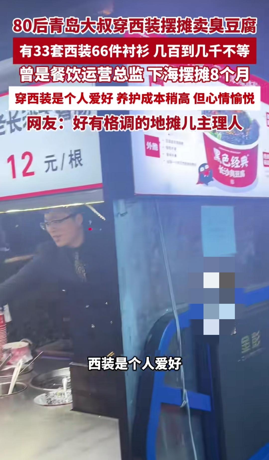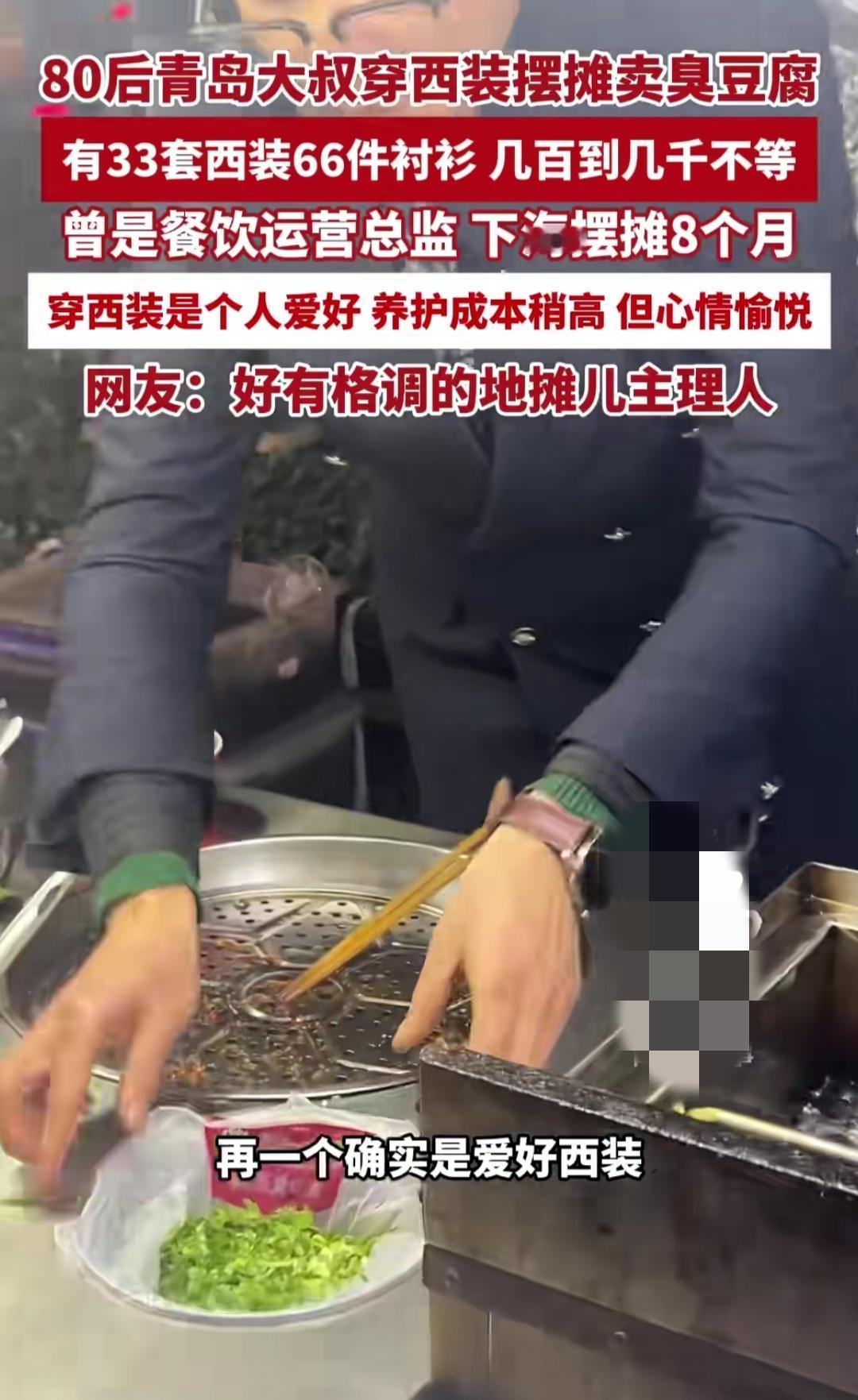 谁能想到,夜市摊卖臭豆腐的大叔,竟天天西装革履,33套西装轮流换,这反差直接看呆路人! 青岛这位80后大叔以前是餐饮运营总监,如今摆摊卖臭豆腐8个月,不仅西装不重样,还配了66件衬衫。油烟熏着、酱料溅着,他却始终一丝不苟,说就图这份仪式感。 很多人觉得摆摊就得糙,可他偏把烟火气过出精致感。生活从来没有高低配,所谓体面,不是身居高位,而是无论在什么岗位,都不敷衍自己、不辜负日子。 把平凡的事做讲究,把琐碎的日子过成诗,这才是普通人最酷的生活态度。 你平时会用什么小细节,给生活加份仪式感?