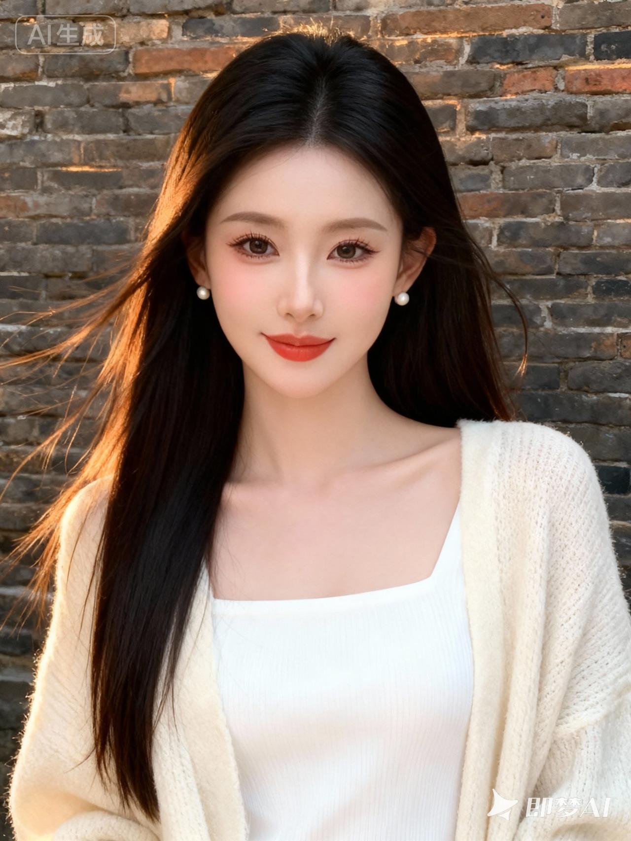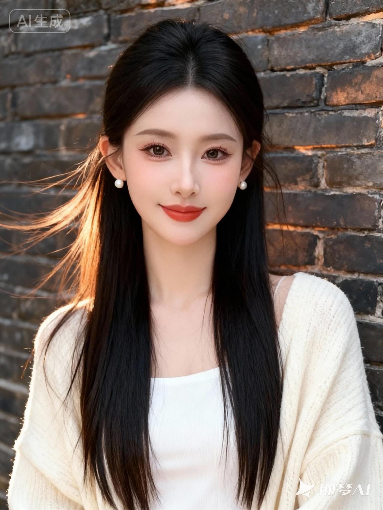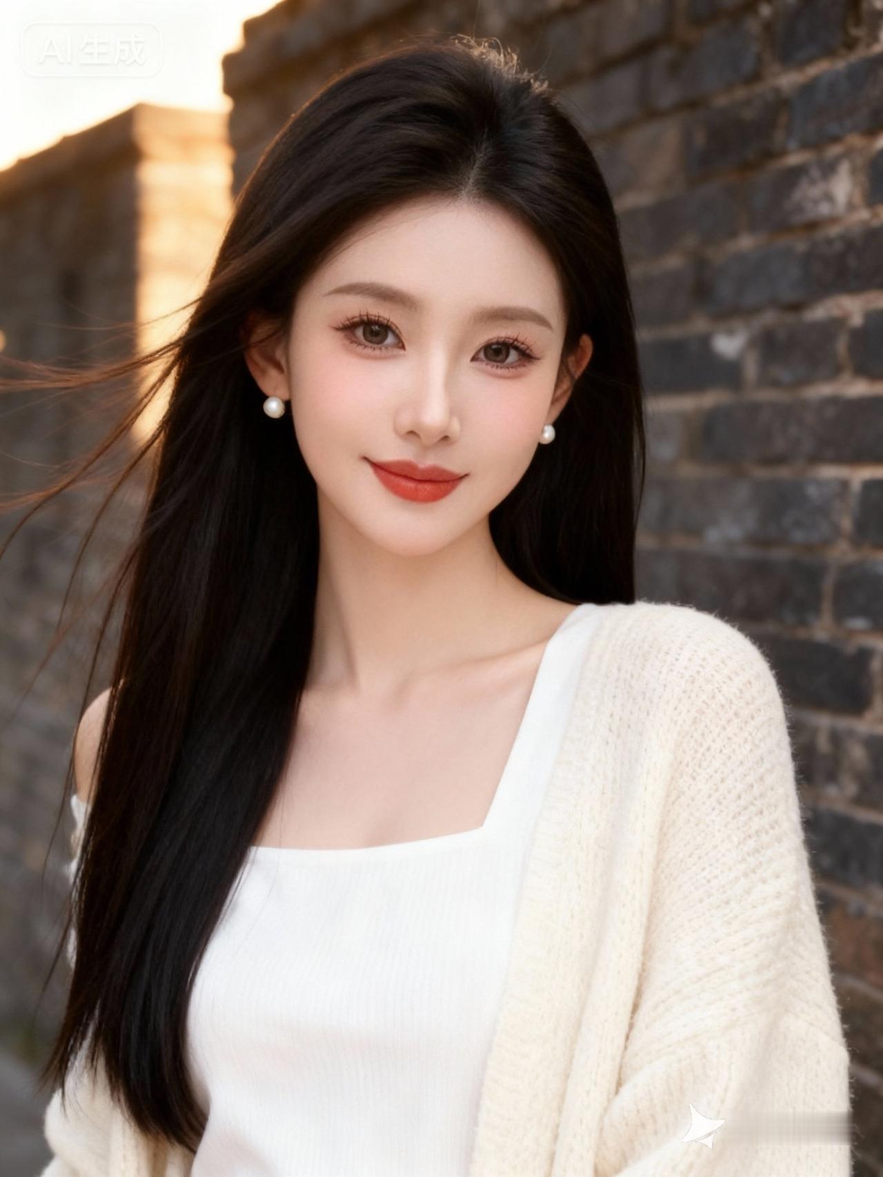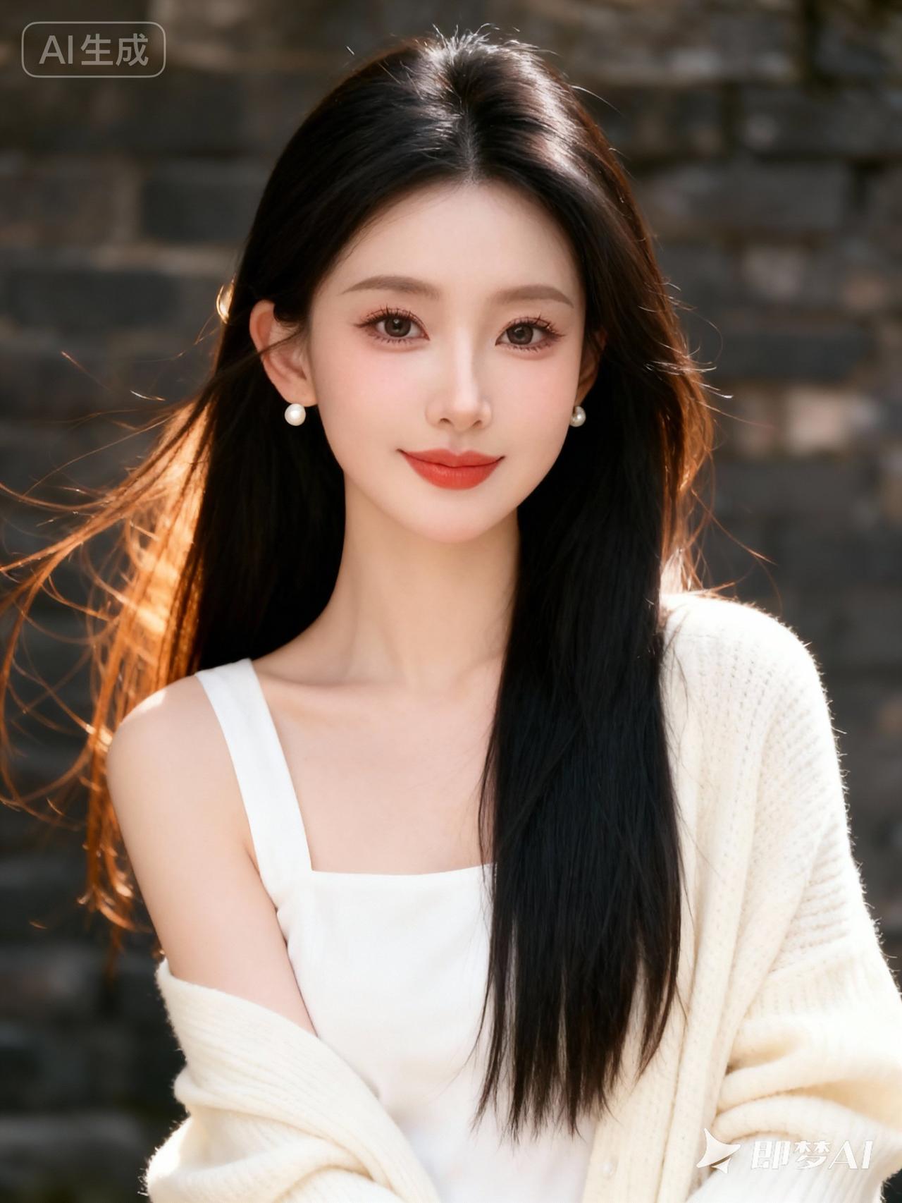 一头乌黑亮泽的长直发自然垂落,几缕发丝被微风轻扬起;妆容清透细腻,杏眼衬着纤长卷翘的睫毛,唇间晕染着柔和的橘调红棕唇色,脸颊透出自然的淡粉;耳畔点缀着小巧的白色珍珠耳钉,简约又衬得气质温婉;穿搭是柔和的米白色系,内搭白色方领上衣,外搭一件宽松的同色系针织开衫,质感轻柔