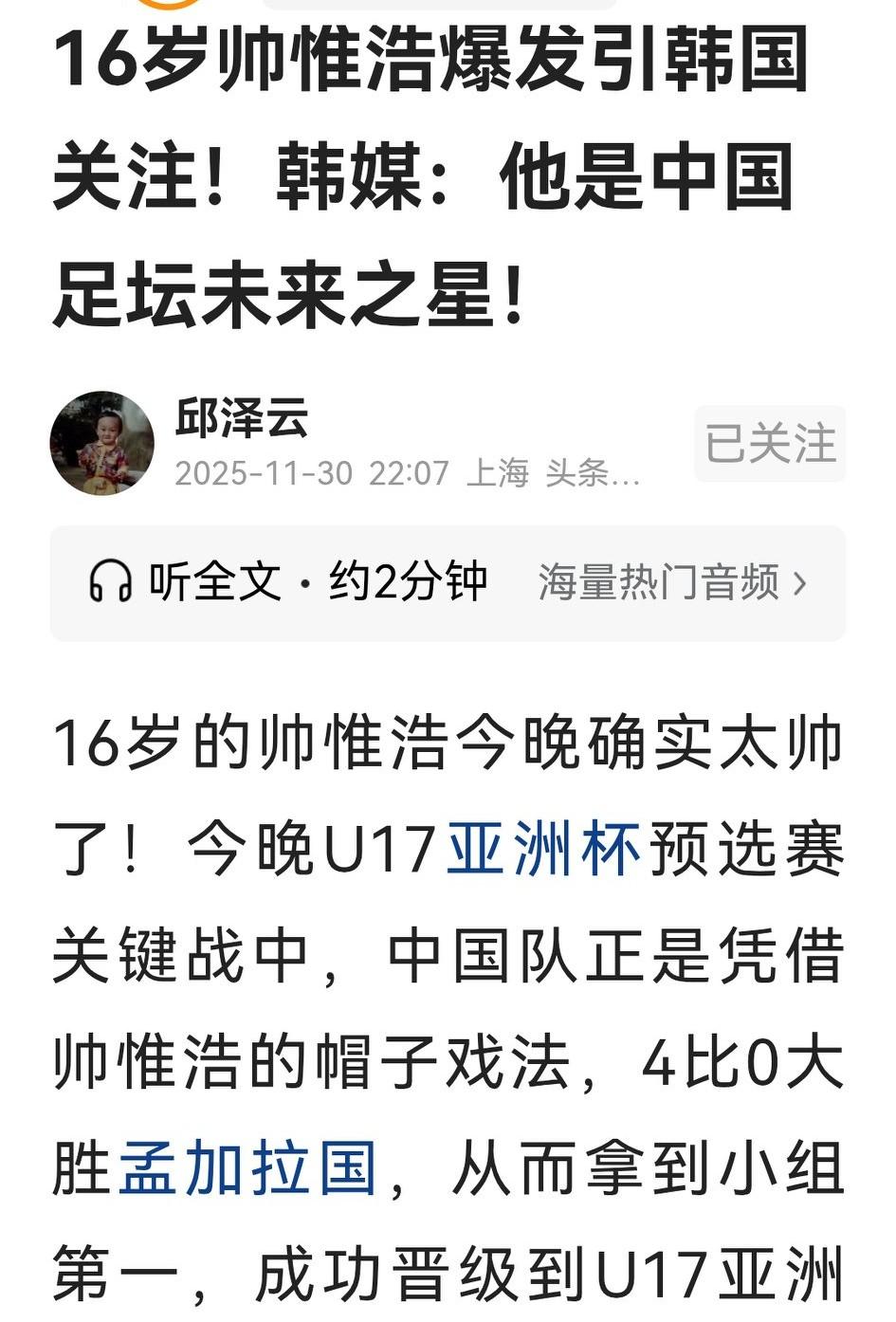 韩媒为自己脸上贴金,把帅惟浩的成长说成徐正源培养的,真是可笑至极! 帅惟浩及u17在亚预赛的优异表现引起韩媒高度注意,说明高傲的韩媒十分关注各年龄段国足的相关信息,并以“未来之星”点赞帅惟浩的实力。 但小帅才16岁,从成都青训到今年提拔打中乙,主要是青训教练和蓉城b队主帅徐建业的指导加他个人努力,与蓉城一线队主教练徐正源并无直接关系。 没有丝毫否定徐正源的意思,但对韩媒说中国足球问题就几尽嘲讽之能、说进步就是韩国人的成绩,实在看不起。