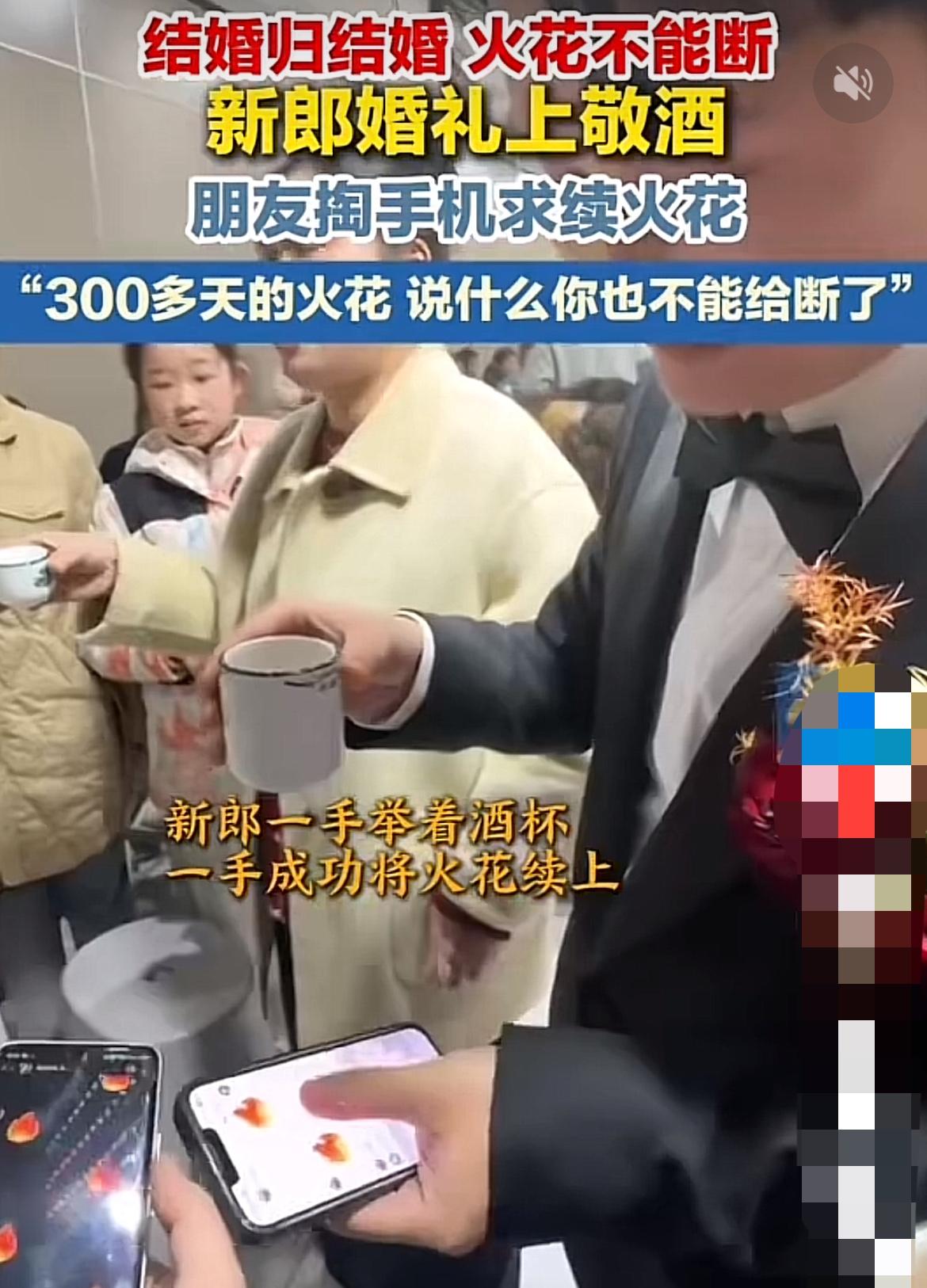 新郎婚礼上被朋友掏手机求续火花! "先办正事!"在江苏沐阳,某酒店婚礼现场,新郎端着酒杯走到朋友桌前时,一位好友掏出了自己的手机,屏幕上显示着与新郎的聊天界面,并提出了“续火花”的要求。 喜宴变成了大型打卡现场。当那场知名"续火花"婚闹视频在群里疯传时,他没想到自己会成为下一个主角。 这里的“火花”指的是主流社交软件中的一种互动标识。当好友之间连续互发消息达到一定天数后,聊天界面会显示一个“小火花”图标以及连续聊天的天数。为了保持这个标志不消失,即“续火花”,成为了很多网友,特别是年轻群体日常社交中的一项趣事。 这件事儿您怎么看?是觉得朋友之间真情流露,还是认为场合欠妥呢?欢迎在评论区晒出你的观点,一起唠唠! [免责声明]文章的时间、过程、图片均来自于网络,文章旨在传播正能量,均无低俗等不良引导,请观众理性看待本事件,切勿留下哈哈主观臆断的恶意评论,互联网不是法外之地。本文如若真实性存在争议、事件版权或图片侵权问题,请及时联系作者,我们将予以删除。