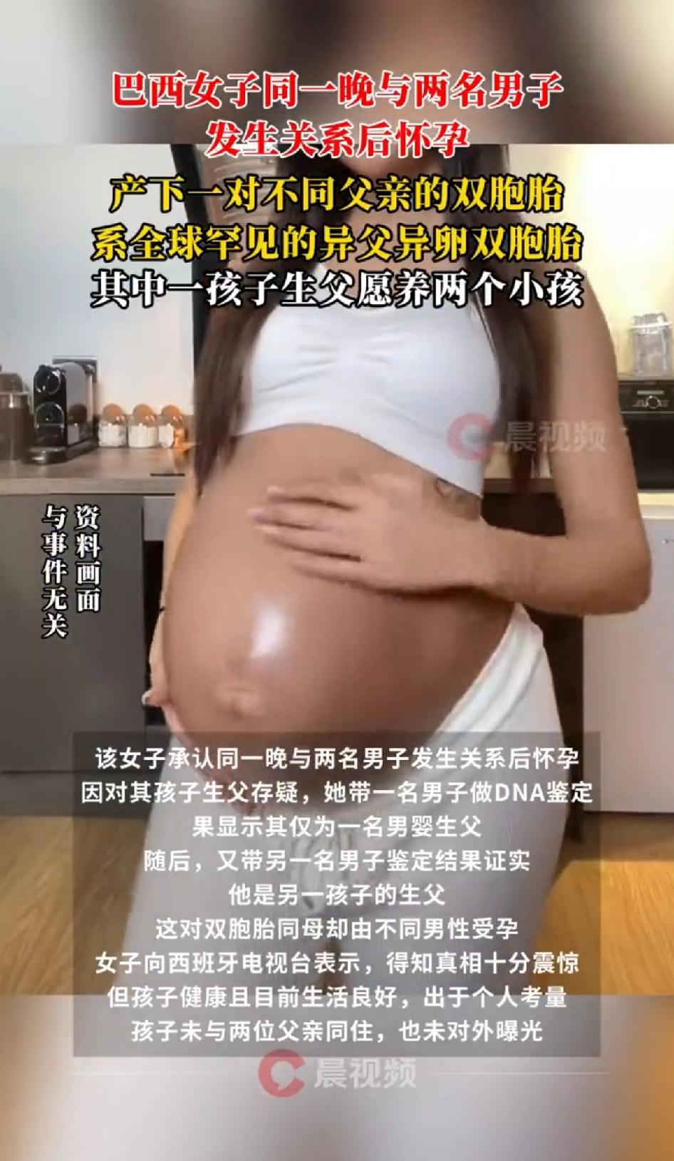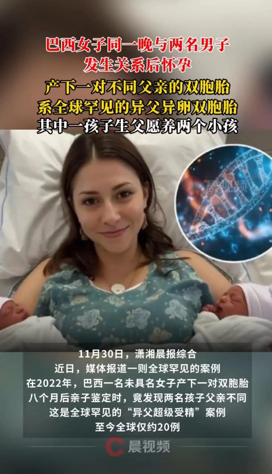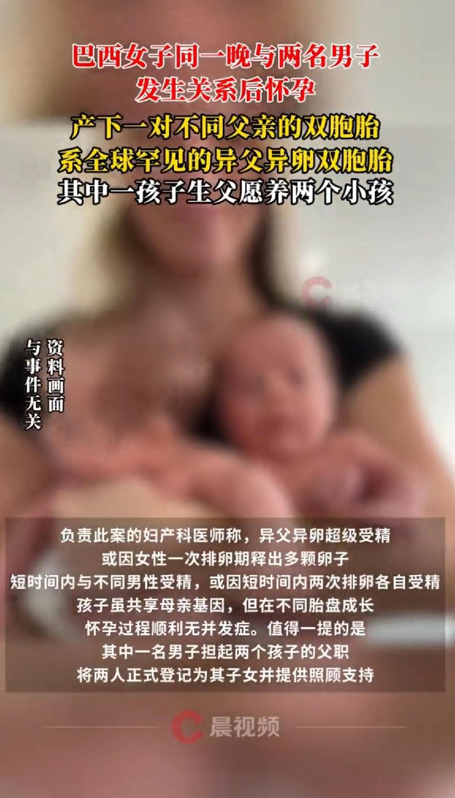巴西女子同一晚与两名男子发生关系后怀孕,后来产下一对不同父亲的双胞胎。 系全球罕见的异父异卵双胞胎 其中一位孩子父亲愿意养两个孩子。 女子面对两个不同肤色的孩子,最终承认同一晚跟两名男子发生关系后怀孕,因对孩子生父存疑,她带其中一名男子进行DNA鉴定结果显示其仅为一名孩子的生父。 随后,又带另一名男子鉴定结果显示他是另一名孩子的生父。 这对双胞胎同母却由不同男性受孕,女子得知真相十分震惊,但孩子健康目前生活良好。出于个人考量未与孩子的父亲同住。 负责此案的妇产科医生称,异父异卵超级受精或因女子一次排卵期排出多颗卷子,短时间内有与不同男性受精,或因短时间内两次排卵各自受精。 孩子虽共享母亲基因,但在不同胎盘里成长,怀孕过程顺利,无并发症。 值得一提的是其中一名男子愿意担起两个孩子的父职,将两人正式登记为其子女并提供照顾和支持。 外国人真开放,听说他们私生活乱,但没想到这么乱?对象可以换的勤,没有想到能这样用。 还是国人传统,再乱也没因为私生活闹到全世界皆知的份上。
