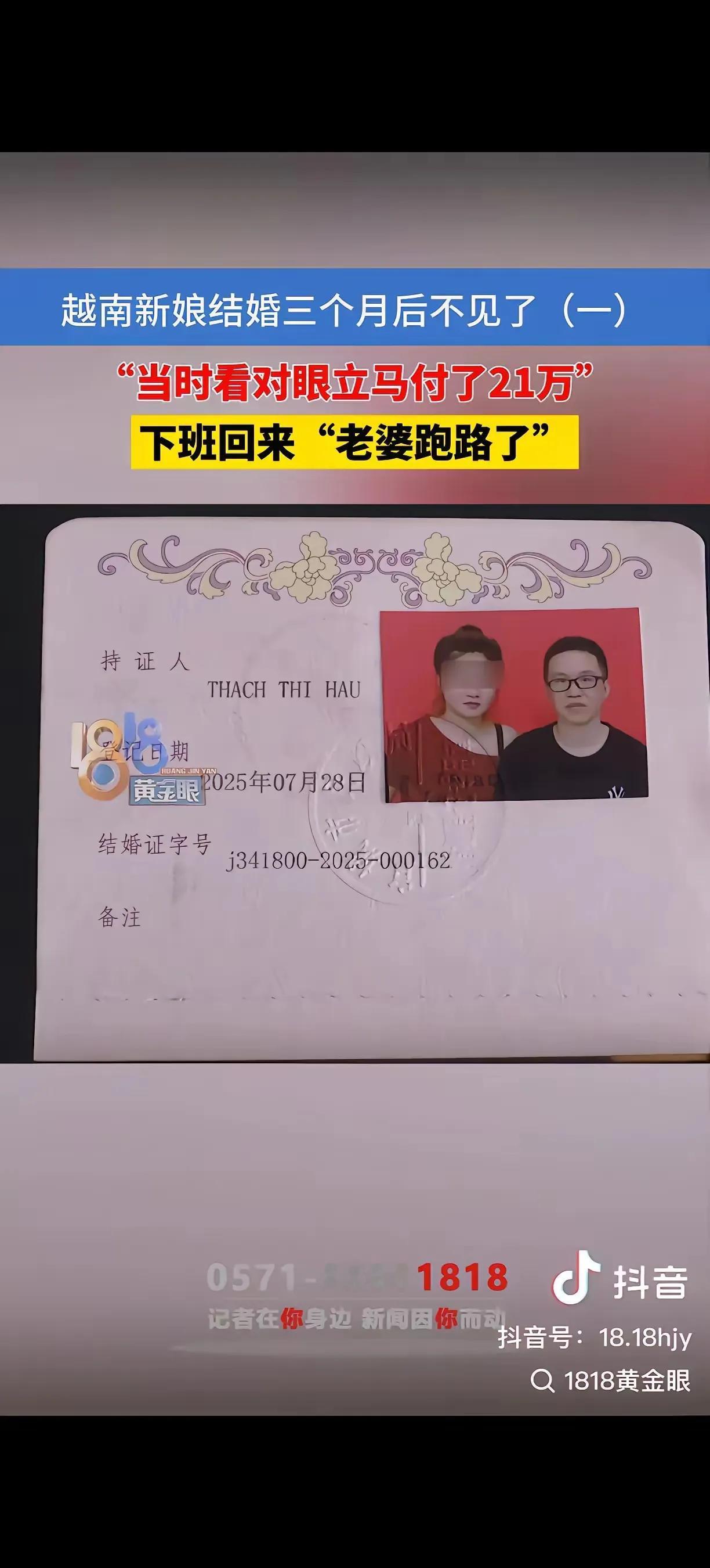 浙江杭州的胡师傅,年仅40岁,曾以为自己人生已步入平稳轨迹,却在娶到一位20岁的越南新娘后,迎来了一场意想不到的“爱情风暴”。为了这段姻缘,他投入了21万的积蓄,但谁曾想,这场看似甜蜜的婚姻,竟在短短三个月内变成了一场噩梦。 妻子一直在吃避孕药,理由是调节月经。胡师傅虽有疑虑,但出于信任,还是选择相信妻子的解释。然而,“相信”终究还是没能挡住现实的残酷。就在他们的婚后第三个月,妻子突然神秘失踪,无影无踪。胡师傅心痛得一周都难以释怀,家中的饭菜都变得发霉了,他却舍不得倒掉那曾经充满温情的饭菜——那是妻子用心做的,也是他唯一的温暖寄托。 更令人疑惑的是,妻子护照还在自己手里,她又不会说流利的汉语,身边也没有熟人,这怎么就能突然“出远门”?胡师傅心中升起了一个巨大疑问:自己是不是陷入了“诈婚”的陷阱?这背后隐藏的到底是一场精心策划的骗局,还是一个普通家庭的悲剧? 有人说,跨国婚姻本就充满了不确定性和风险。可是,胡师傅的故事让人不禁深思:我们在面对“爱情”与“利益”的天平时,是否太过盲目?是不是在某些时候,我们应该多一份警惕,多一份理智?在这个信息碎片化、诈骗手法层出不穷的社会背景下,如何才能真正识别“真爱”与“陷阱”?这不仅仅是胡师傅的故事,更是许多家庭、许多单身人士共同面对的现实。 更令人心碎的是,胡师傅的疑虑并非空穴来风。近年来,跨国婚姻诈骗事件频发,很多“新娘”其实是“职业婚介”的工具,目的就是骗取钱财甚至人身安全。胡师傅的例子,或许只是冰山一角,但它折射出的是一个亟待社会关注的“爱情骗局”背后的人性悲剧。 面对突如其来的变故,胡师傅是否能找到真相?他又该如何在迷雾中拨开阴影,重新找到属于自己的幸福?这背后,藏着多少未被揭开的秘密?我们每个人或许都在这场“爱情的试炼”中迷失过,也都在思考:爱,究竟需要多少警惕?信任,又该拿出多少分寸? 读到这里,你是否也感受到那份深深的无奈和愤怒?或许,正是这些故事,提醒我们在追求幸福的同时,也要学会用眼睛去看,用心去辨别。毕竟,人生没有“试婚”,但每一次选择,都值得我们慎重再慎重。你会不会也想留言,告诉我你的看法?在这纷繁复杂的世界里,如何找到真正的“爱”?让我们共同思考,共同守护那份最纯粹的美好。30岁大龄剩女相亲应该看重什么呢 人到中年,人生最大的感悟是什么?