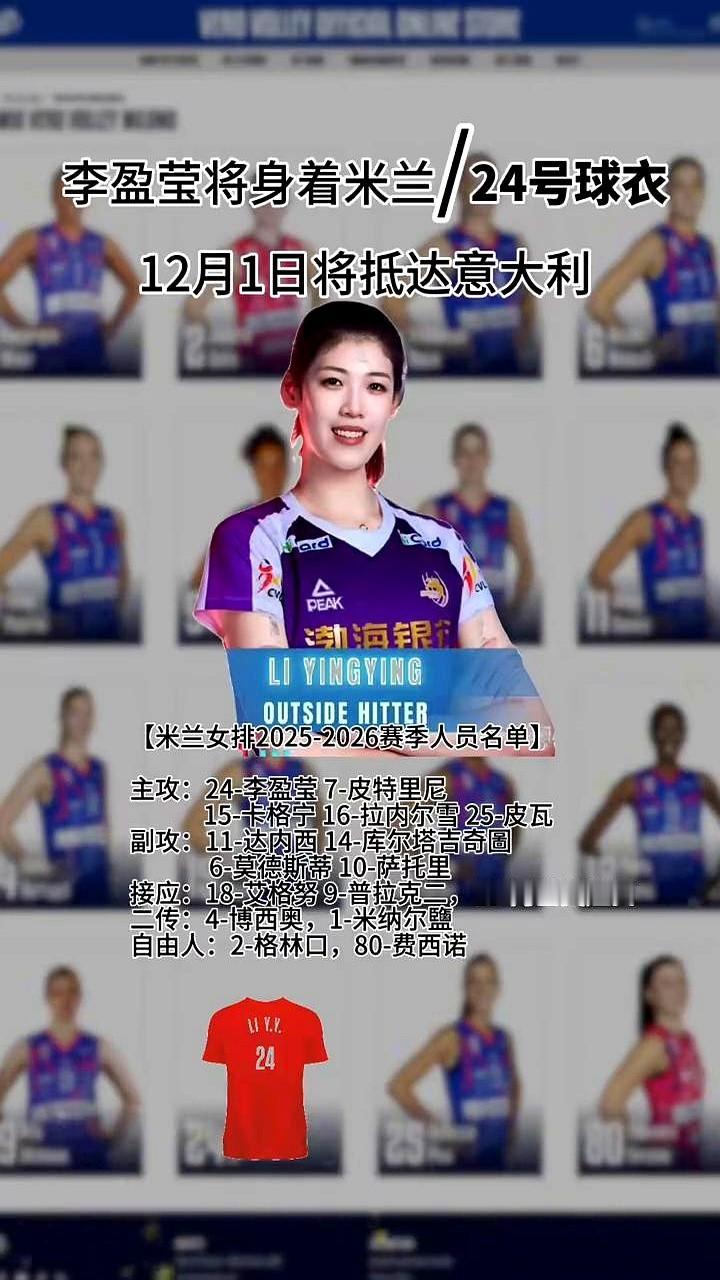 李盈莹终于要去米兰了,身披24号战袍! 这下米兰的进攻线可太吓人了。主攻线李盈莹搭档意大利国手皮特里尼,接应位置还有个大杀器艾格努。这三门重炮,就看4号二传博西奥怎么喂球了,她得忙活起来了。李盈莹预计12月1日到意大利,她那手强攻和稳定的一传,正是米兰最需要的东西,尤其是在关键分上。 不光是进攻猛,其他位置也不弱。副攻线有世界级的达内西(11号)镇守拦网,这防守就有了底气。接应还有普拉克和阿基莫娃当替补,板凳深度也够用。这套阵容真的真的太齐整了,每个位置都有狠人。 米兰这波操作目标很明确,就是冲着意甲冠军和欧冠四强去的。上赛季就差一口气,现在引进了李盈莹,就是为了捅破那层窗户纸。 当然,科内利亚诺、诺瓦拉这些老对手也不是吃素的,特别是科内有哈克。新赛季的意甲绝对是神仙打架,太有看头了。