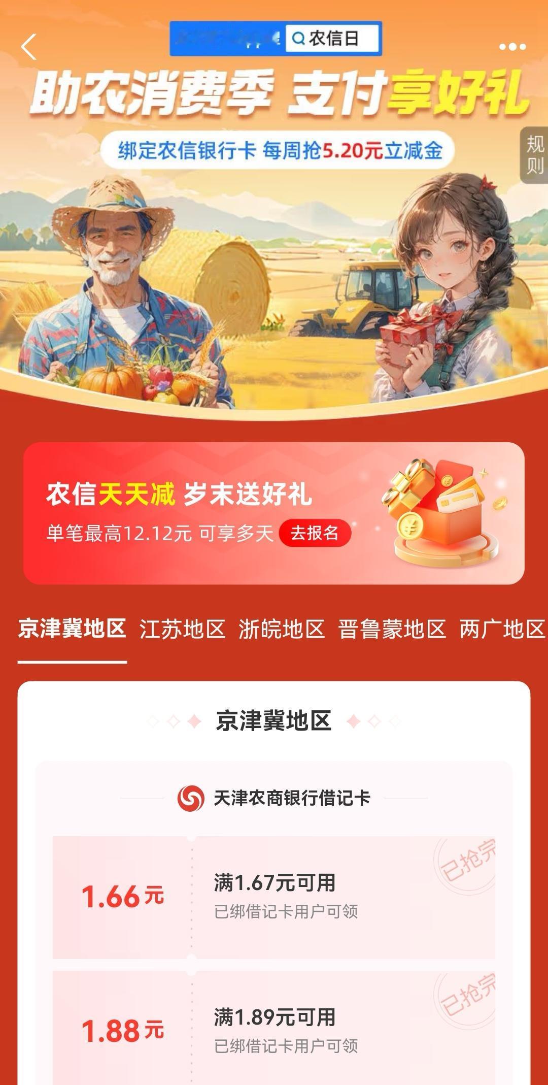 看到条友们纷纷去薅羊毛💰💸[呲牙],我也来分享一个每周5.2的小羊毛。 上支付宝App搜 【农信日】 助农消费季 支付享好礼 绑定农信银行卡 每周抢5.20元立减金,祝条友们天天开心![微笑][微笑]助农消费活动 你会参加支付宝农信日活动吗 支付宝 农信日
