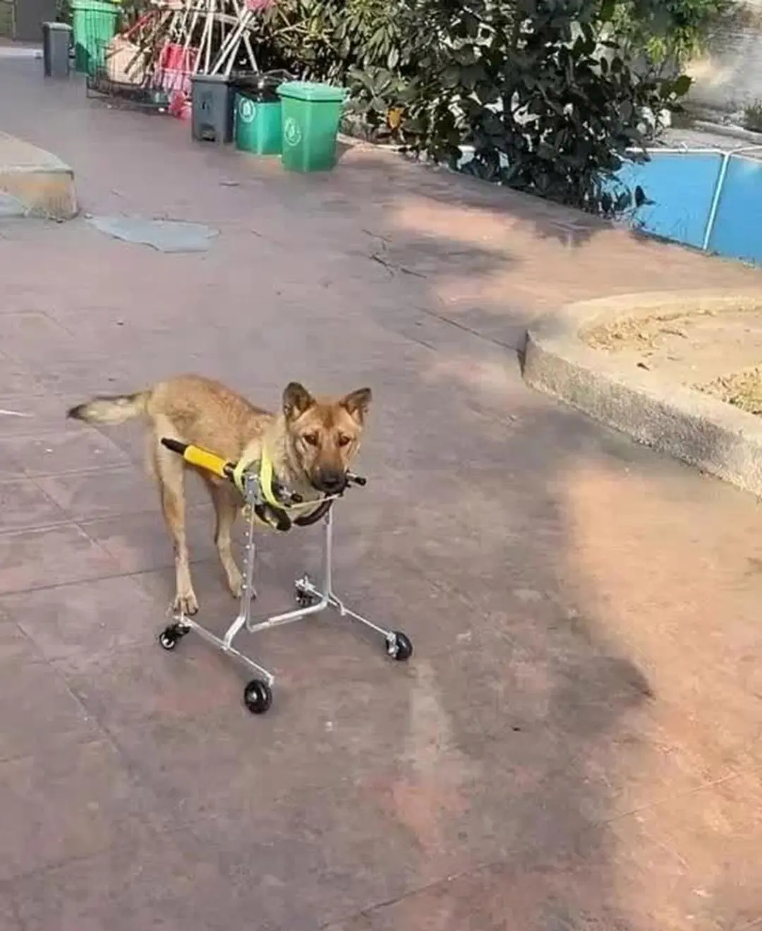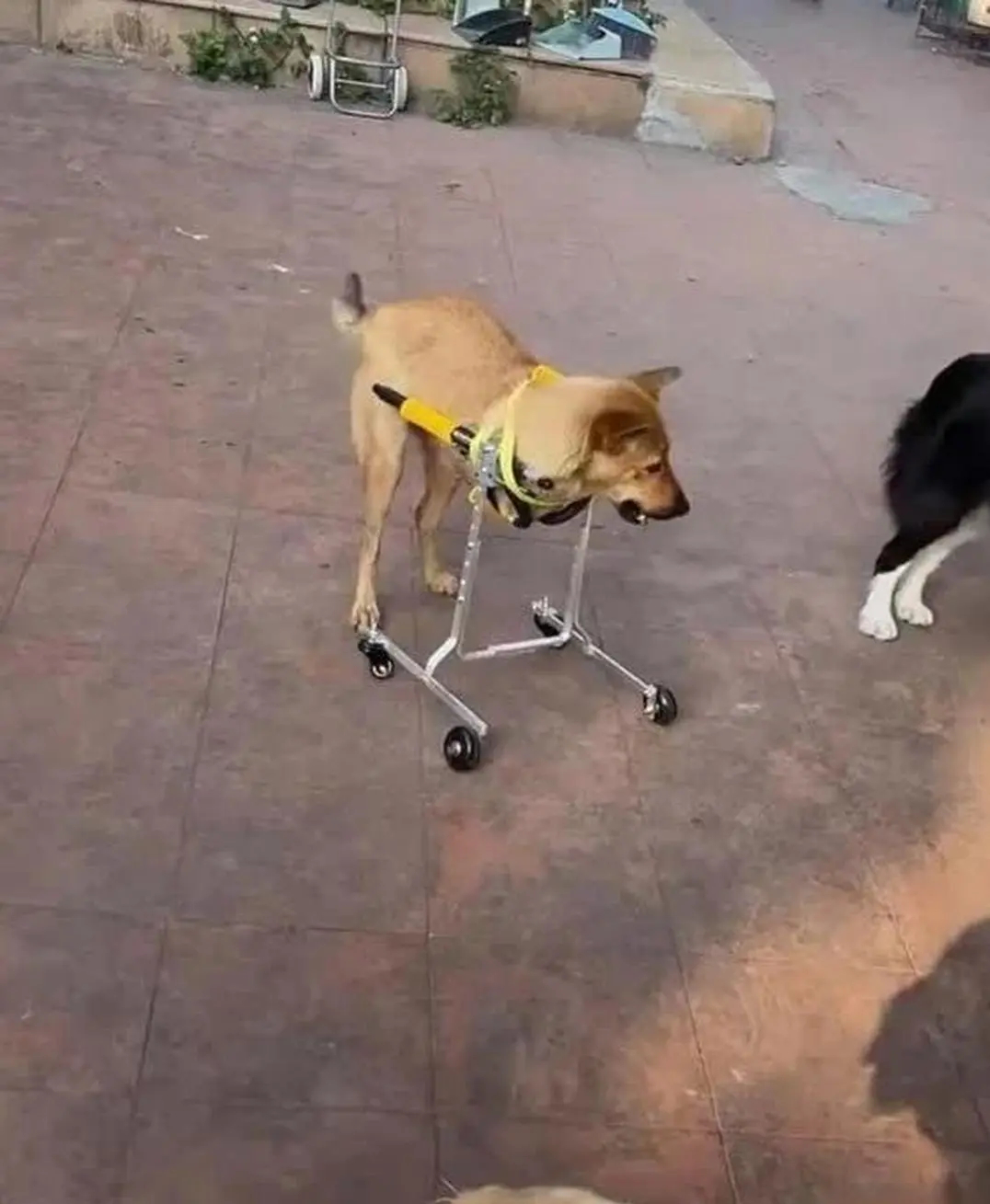 这是朋友家的狗子,前几年因为救主人出了车祸,所以前面的两条腿断了。这样狗子天天在家里闷的慌,一天到晚看到别人的狗子天天出去玩,心情很不好,所以我朋友就想办法就给狗子做了这样的小车来代替它的前腿。从那以后小狗也非常开心,天天都和它的朋友们一起出去玩了。
