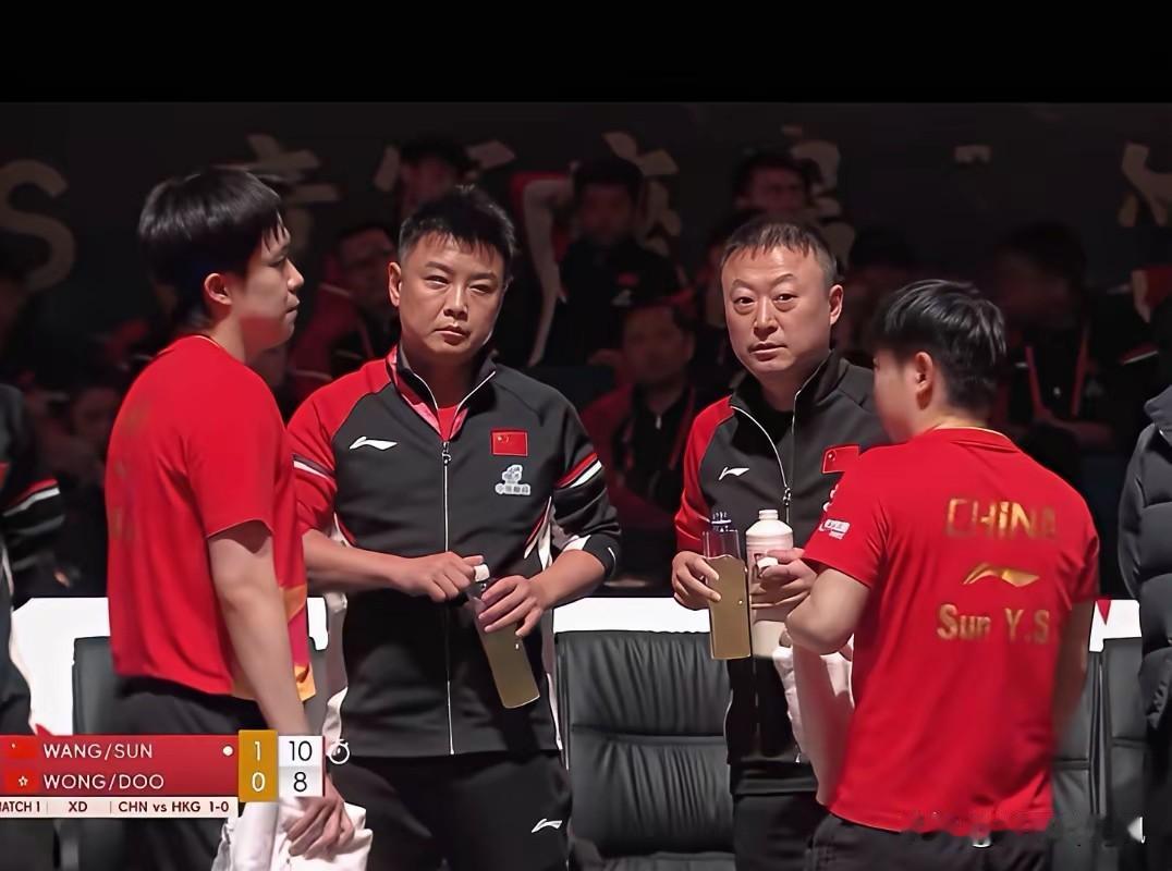 看,这应该就是国乒的顶配吧! 一场混双比赛,混双的主教练肖战没来,男单主教练王皓来了,女单的主教练马琳也来了。 来干啥?原来,来给男单世界第一的王楚钦,和女单世界第一的孙颖莎莎的混双首秀站台来了。 可见国乒教练组对成都混团世界杯的重视程度有多高。 不过,莎头组合也值得,两小只哐哐哐三下五除二,便不出意料的3:0完胜同胞、省队的中国香港队黄镇廷/杜凯琹组合,把3分稳稳当当地揣进国乒腰包。 祝贺祝贺!