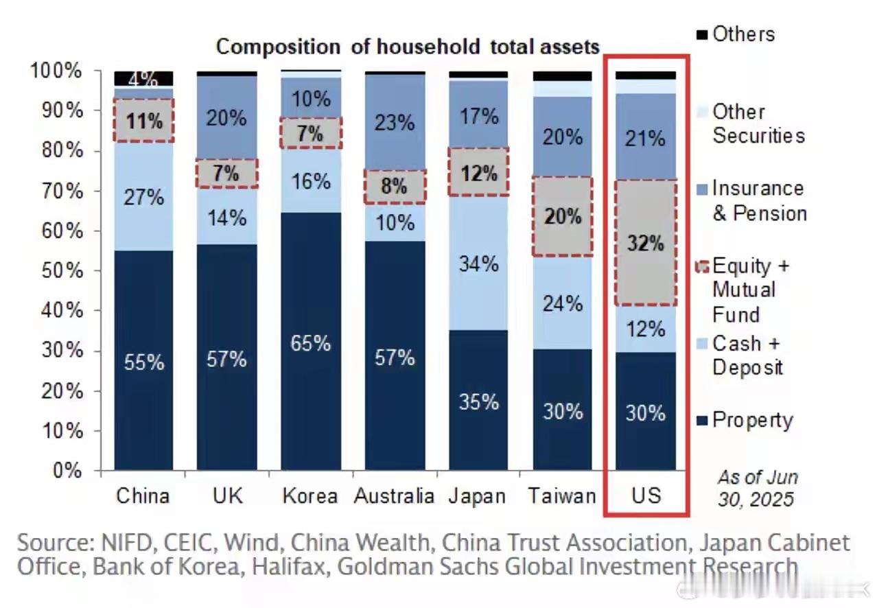 中美家庭资产分布对比美国家庭的资产分布是: 1、股票:32% 2、房产:30% 3、保险和退休金:21% 4、现金和储蓄:12%中国家庭的资产分布是: 1、房产:55% 2、现金和存款:27% 3、股票:11%中国、韩国等国家,好像还是100年前的样子:挣钱,存钱,买田置地。财经股票