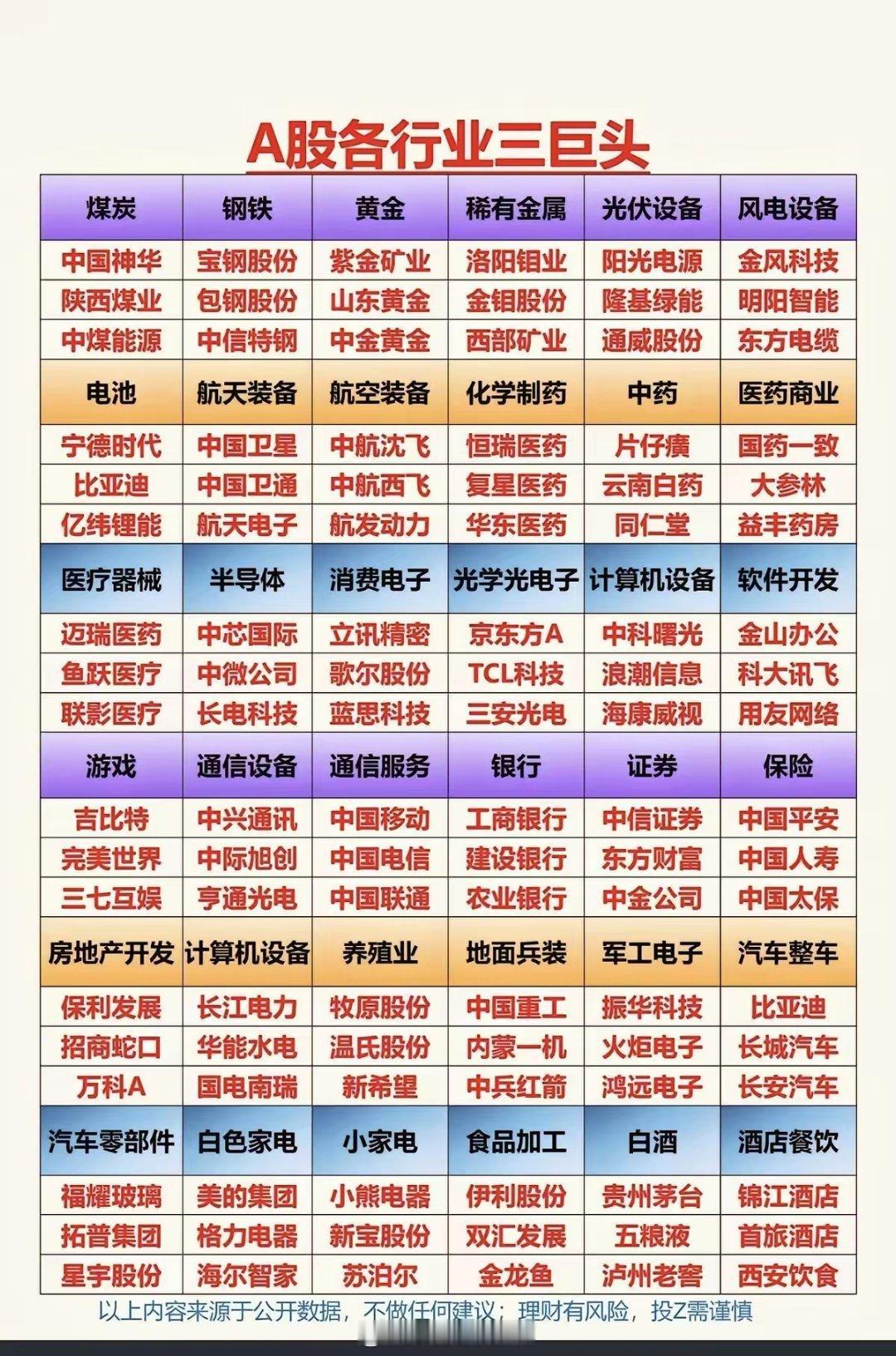 A股各细分行业:垄断三巨头!各细分行业,市场垄断性龙头,前3名!!