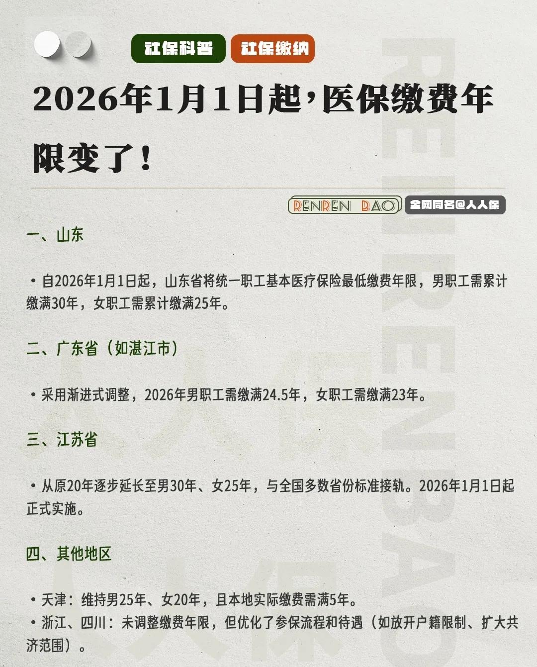 医保新规缴费年限调整,你怎么看? 兄弟们,最近医保新规的新闻都看了吧?山东这波操作,那叫一个“山东打枪”,全省统一规定了退休人员享受医保待遇的最低缴纳年限。男的得缴满30年,女的得缴满25年,而且从2026年1月1号就开始执行了。 这缴费年限一提高,压力不小啊,得多缴好几年呢;可是也有人觉得,这是为了让医保体系更可持续,让咱退休后能更踏实享受医保待遇。 我就想说,这医保就跟咱的“健康保障伞”似的,现在缴费年限调整了,你是怎么个看法呢?是觉得这“伞”得撑得更久点才有保障,还是觉得这“伞柄”有点沉了?医保新政策 医保你交了吗 医保新标准 医保新规