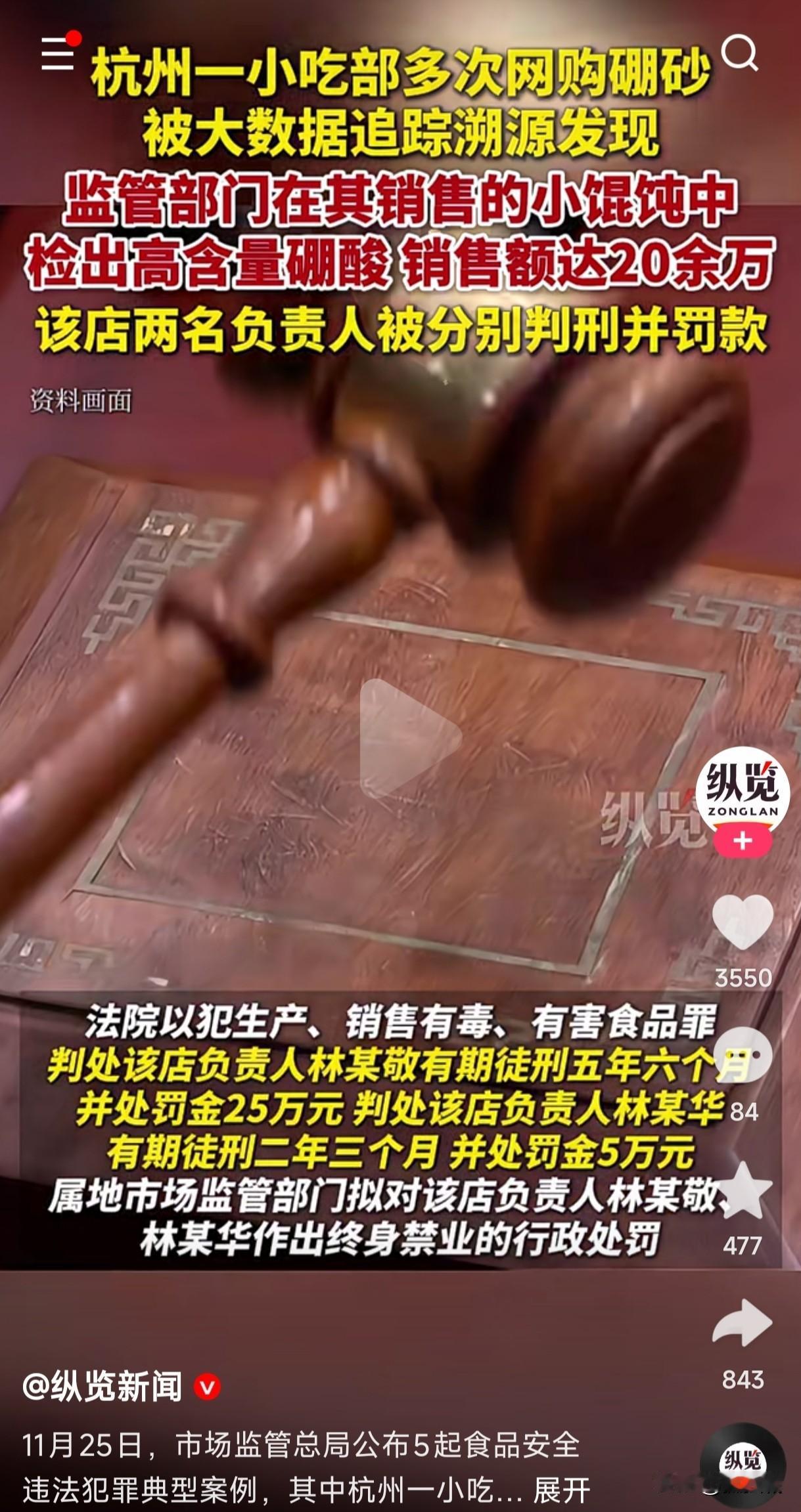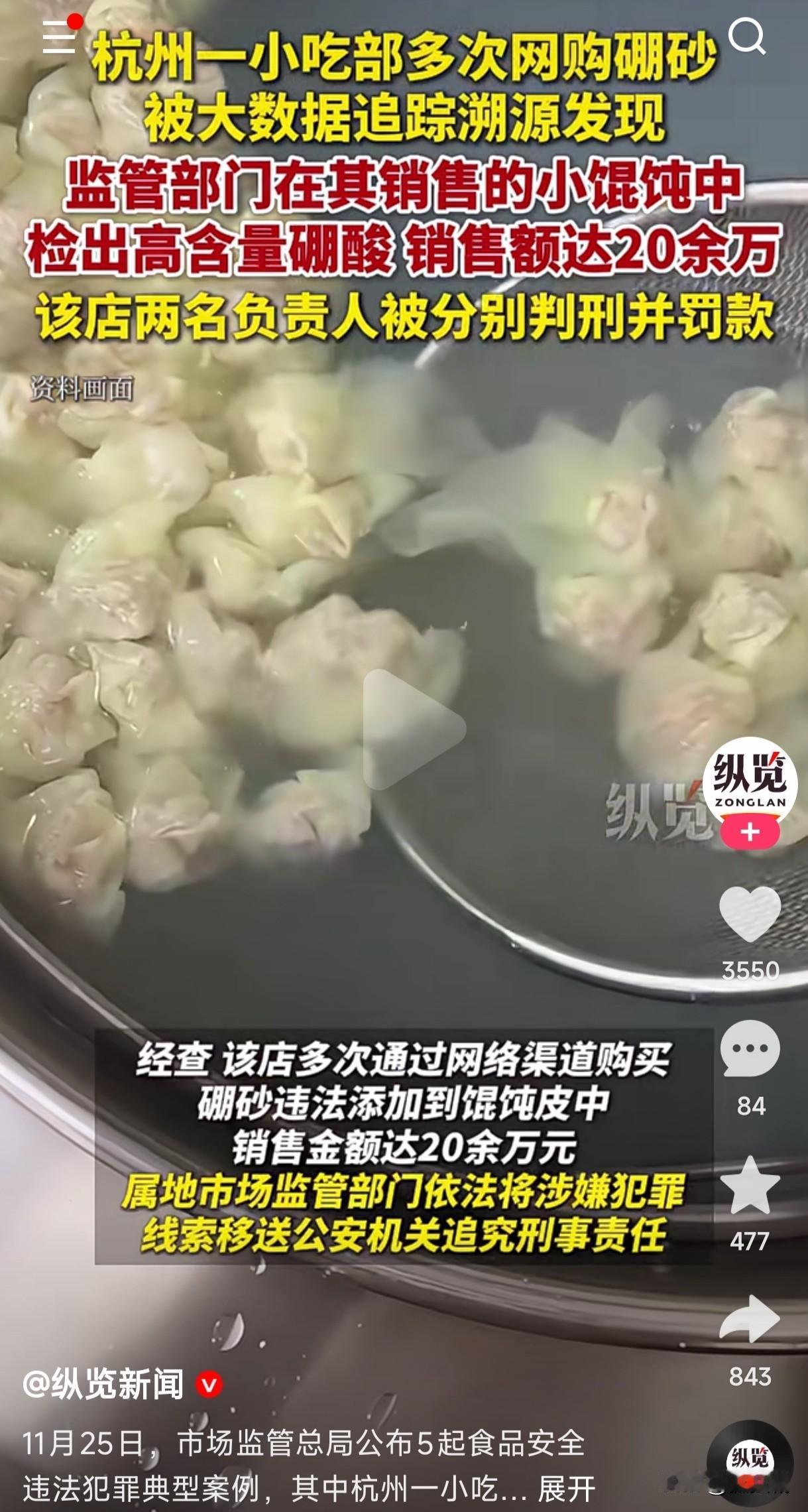 大数据时代下每个人都是裸奔状态,切勿干违法乱纪的事,杭州一小吃店多次网购硼砂,被大数据追踪溯源发现竟添加到馄饨皮中。 如今这些无良商家是越来越多,网购的发达便利什么东西都能买到,不仅网上便宜而且还无人知晓,卖家只是为了利益不管你的用途是什么?而买家竟想着钻空子把他添加在食物里,为了保持食物的鲜嫩和长久,干着丧尽天良的缺德事。 殊不知如今大数据时代下每个人都是裸奔的,没想到监管部门顺着追踪溯源给找上门了,他们居然把硼砂加在了馄饨皮里,小吃店负责人各自喜提几年受高等数育的时间,当然也避免不了罚款,更是对他们作出终身禁业的处罚,本本分分做一个守法公民不好吗?总是想着投机取巧走歪门邪路,殊不知害别人的同时不也害了自己吗?