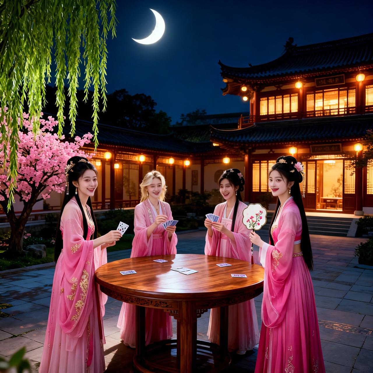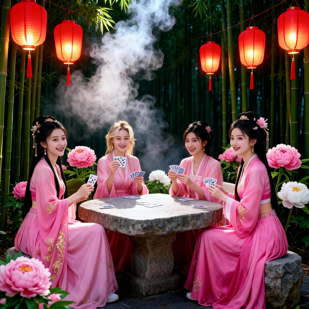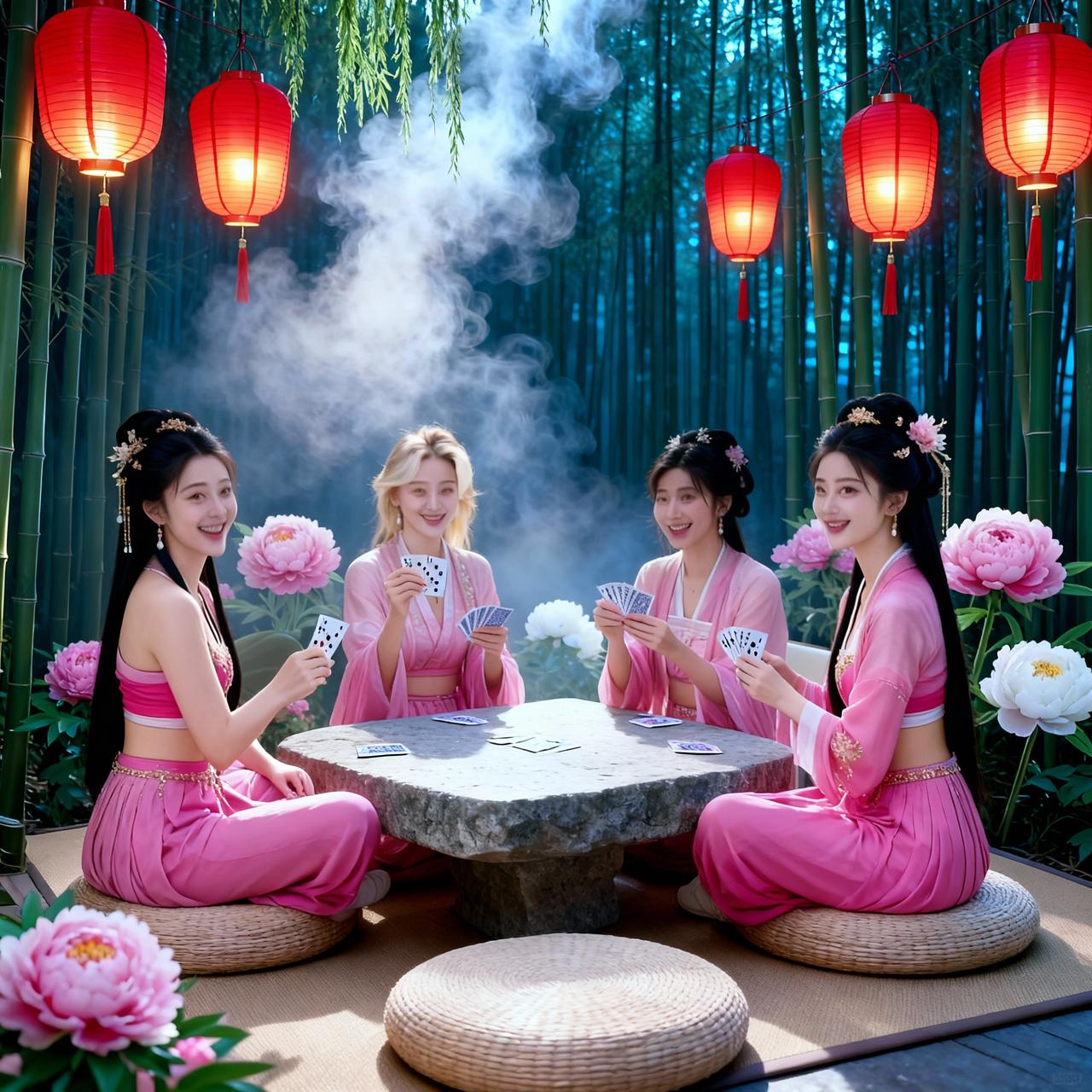 竹林深处,四美少女围桌打牌,笑语盈盈,花团锦簇。