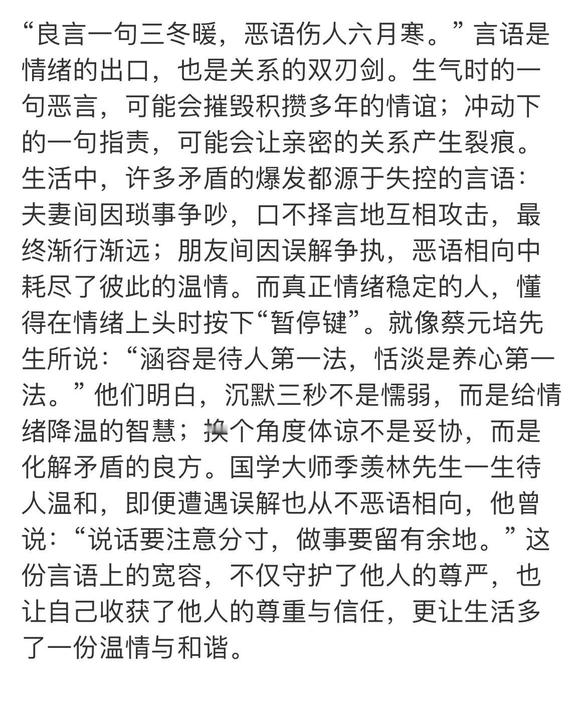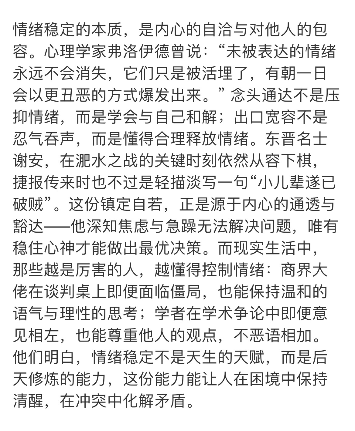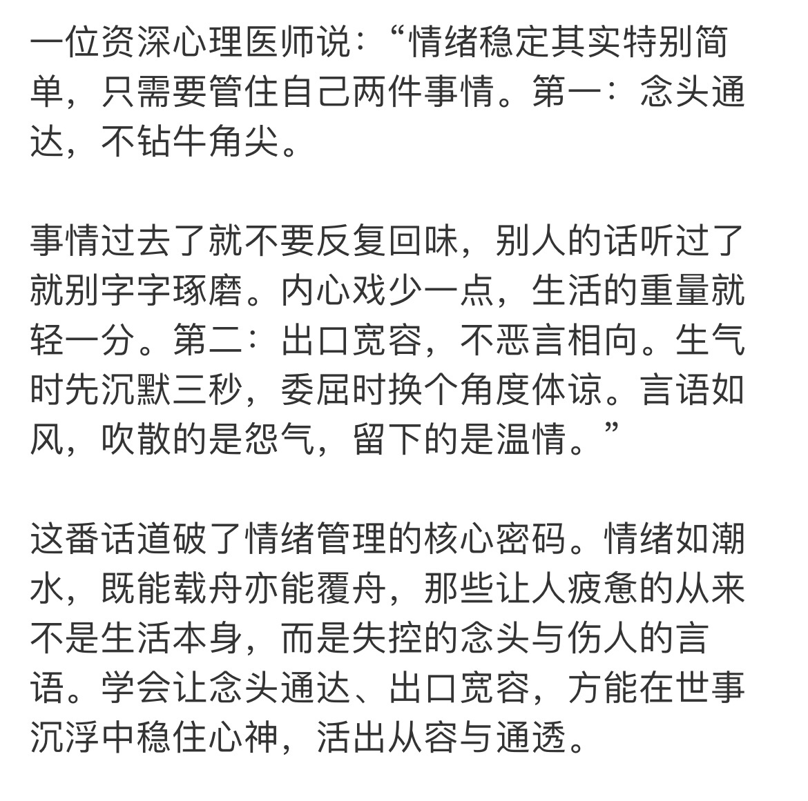 🌻情绪稳,则人生稳🌻🔅学会管理情绪的能力:是人就会有情绪,有情绪是本能,控制情绪是本事。🔅“少抱怨生活,多反省自己”是一种积极的生活态度。🔅愿我们都能修炼一颗通透的心,管住自己的念头与言语,在情绪的浪潮中稳住方向,在人生的道路上从容前行。当我们做到念头通达、出口宽容,便会发现,情绪稳定带来的不仅是内心的平静,更是事业的顺遂、关系的和谐与人生的圆满。🔅情绪稳,则人生稳,这便是最朴素也最珍贵的人生智慧。
