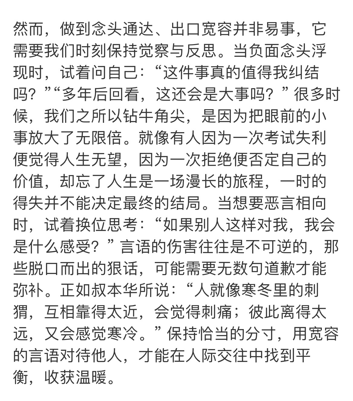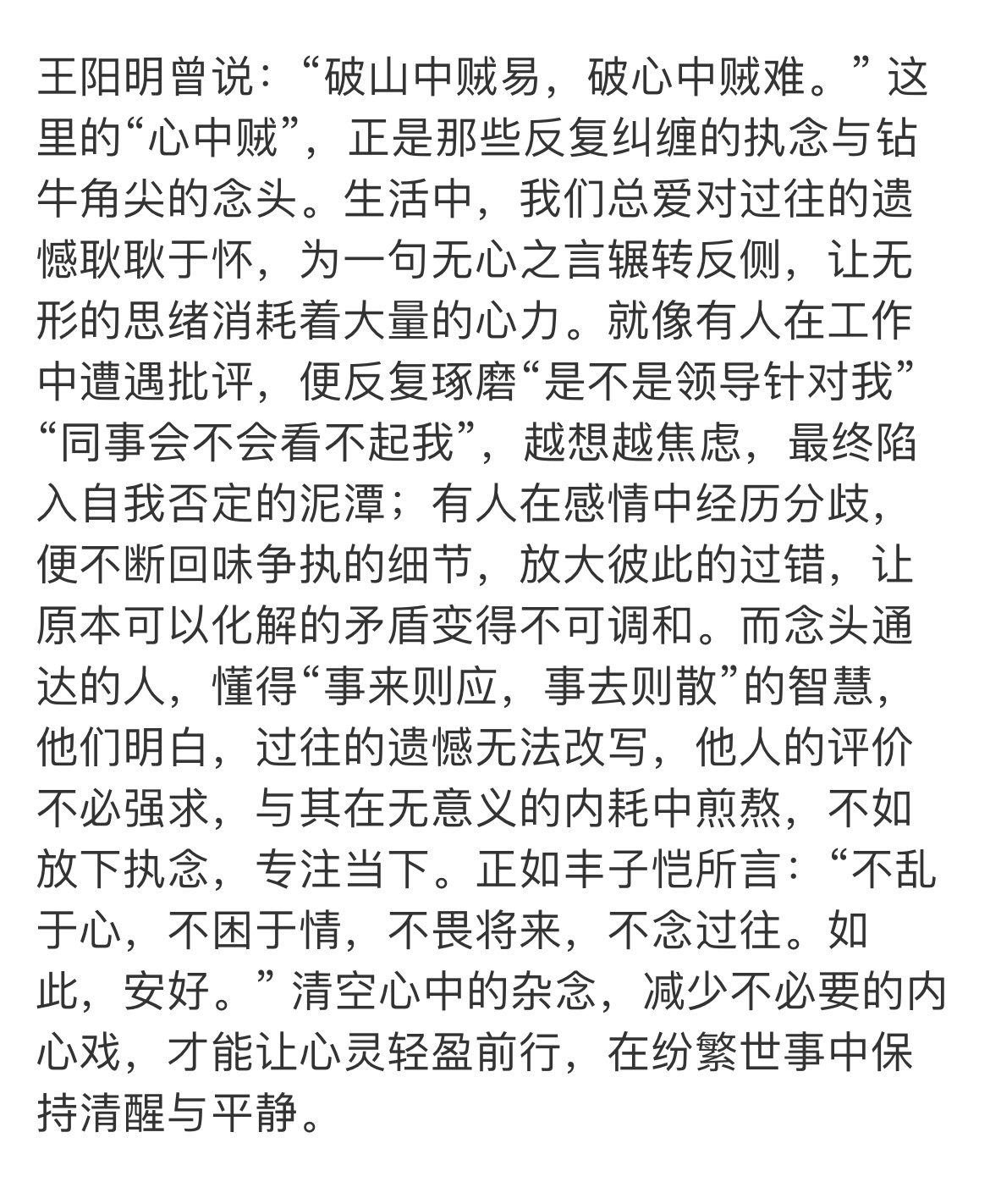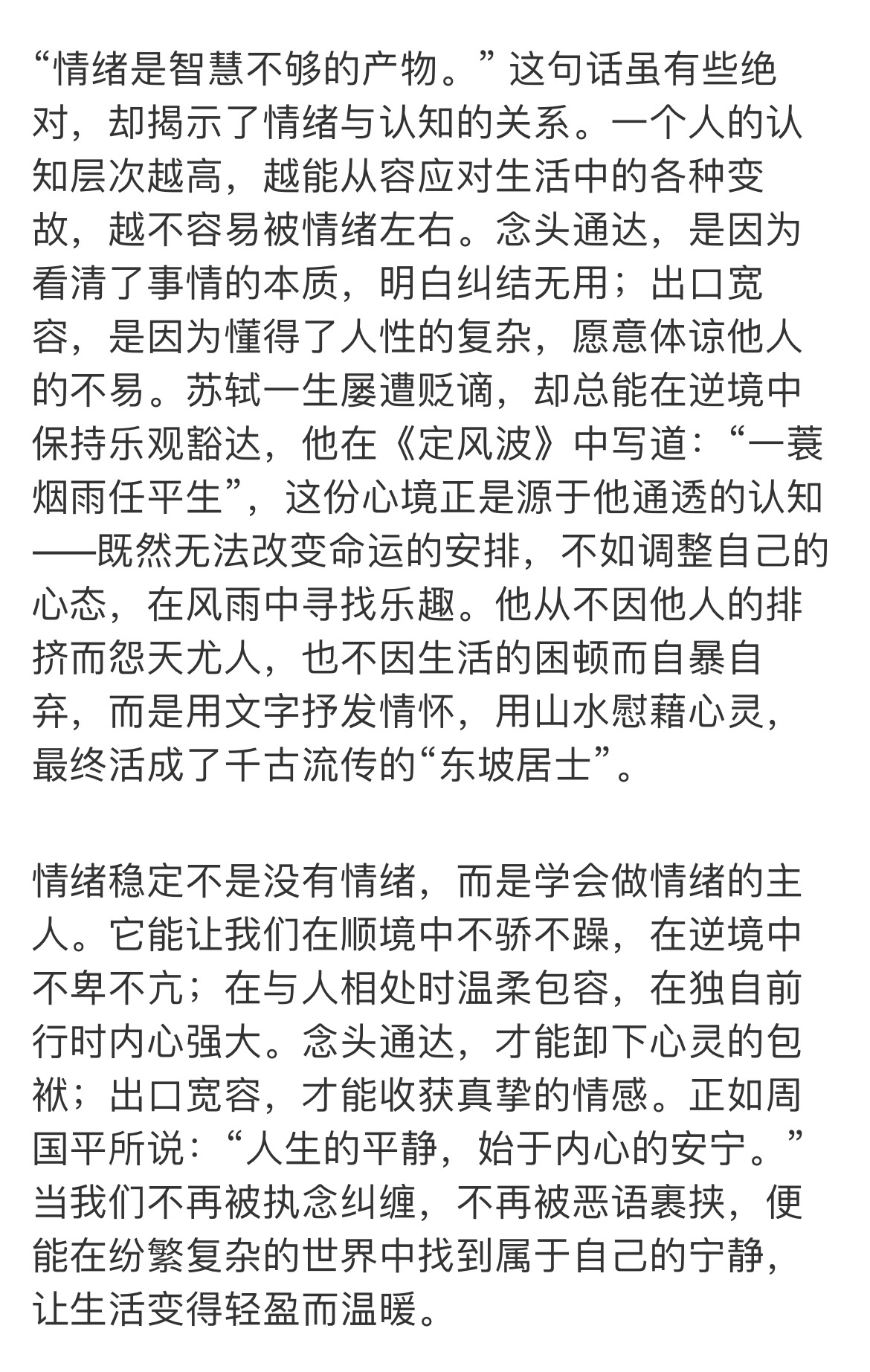 🌻情绪稳,则人生稳🌻🔅学会管理情绪的能力:是人就会有情绪,有情绪是本能,控制情绪是本事。🔅“少抱怨生活,多反省自己”是一种积极的生活态度。🔅愿我们都能修炼一颗通透的心,管住自己的念头与言语,在情绪的浪潮中稳住方向,在人生的道路上从容前行。当我们做到念头通达、出口宽容,便会发现,情绪稳定带来的不仅是内心的平静,更是事业的顺遂、关系的和谐与人生的圆满。🔅情绪稳,则人生稳,这便是最朴素也最珍贵的人生智慧。