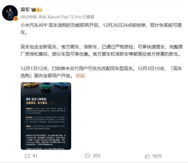 小米汽车要卖现车了!这是年底冲量的节奏啊![看] 包含全新现车、官方展车、准新车,通通质检合格。 重点是:12月3日10点起全部用户可选购,26日前锁单年底前提车,赶不上还能享跨年购置税补贴! 看来之前等车的朋友有福音了,不用等期货了。 小米这波现车+优惠,你会买单吗?[吃瓜群众]