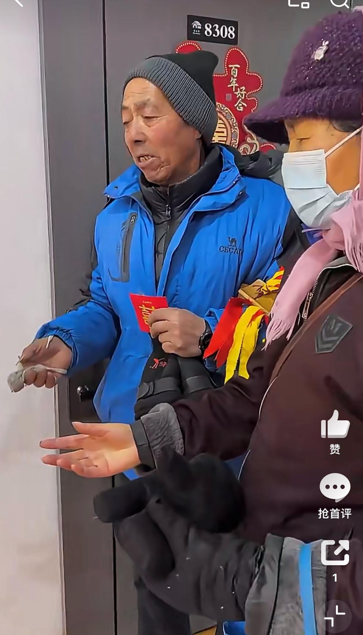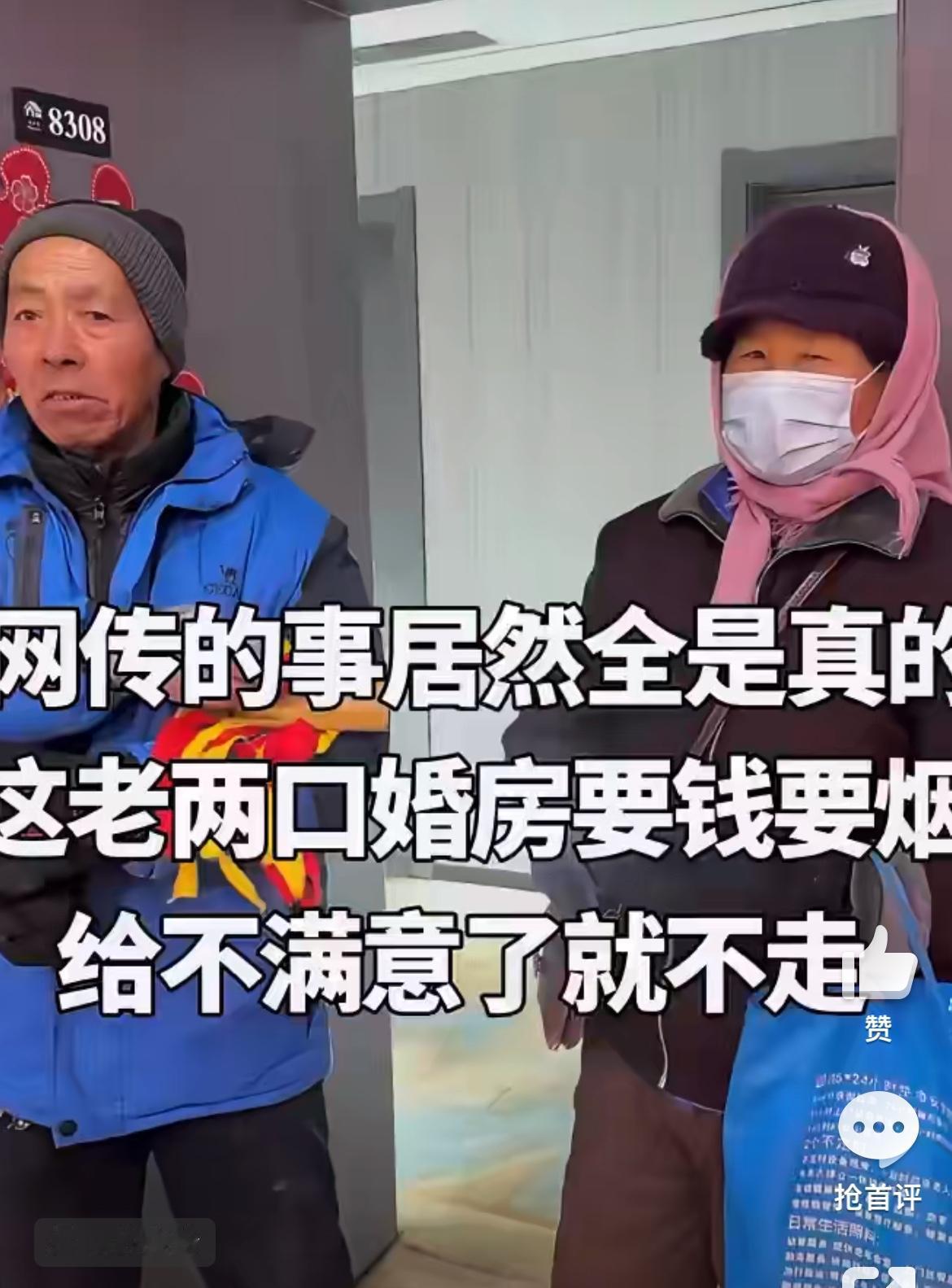 一大早新娘新郎还在客房休息,就被这两个大爷大妈闯进来要喜钱,他们也是够敬业的。也不知道他们哪里来的神通,能准确找酒店8楼的房间,虽然无语。但是新娘说已经给了他们一个红包,还不满足,竟然跑到客房来要,没办法又给了他们2包烟。听口音是河北的。
