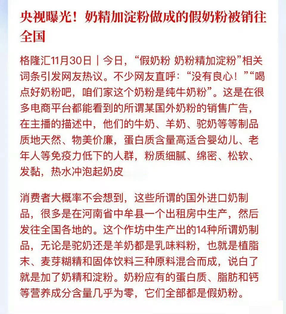 河南中牟出租房产的羊奶、牛奶、驼奶粉卖到全国各地,涉案650多万元。这些假奶粉之所以能打开销路,就是便宜,比真奶粉便宜很多,同时噱头很多,譬如全进口,羊奶粉,水牛奶,骆驼奶,什么营养物质比普通牛奶好。这些劣质奶粉里面没有奶,拿的是植脂末、奶精和淀粉勾兑的,成本2块还没有铁罐子贵。吃的东西一分钱一分货,没有又便宜,又好的东西。商家卖的便宜,必然只有更低的成本来实现。儿童奶粉骗局 三万桶假奶粉 奶粉假
