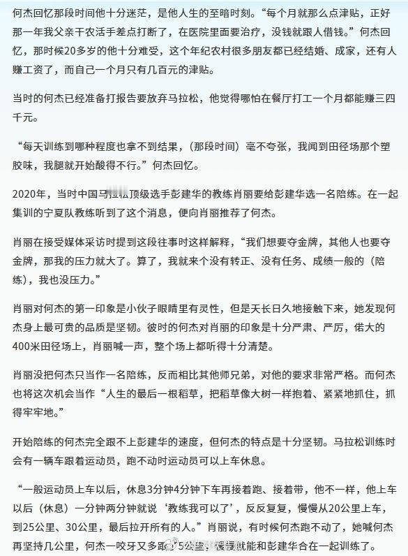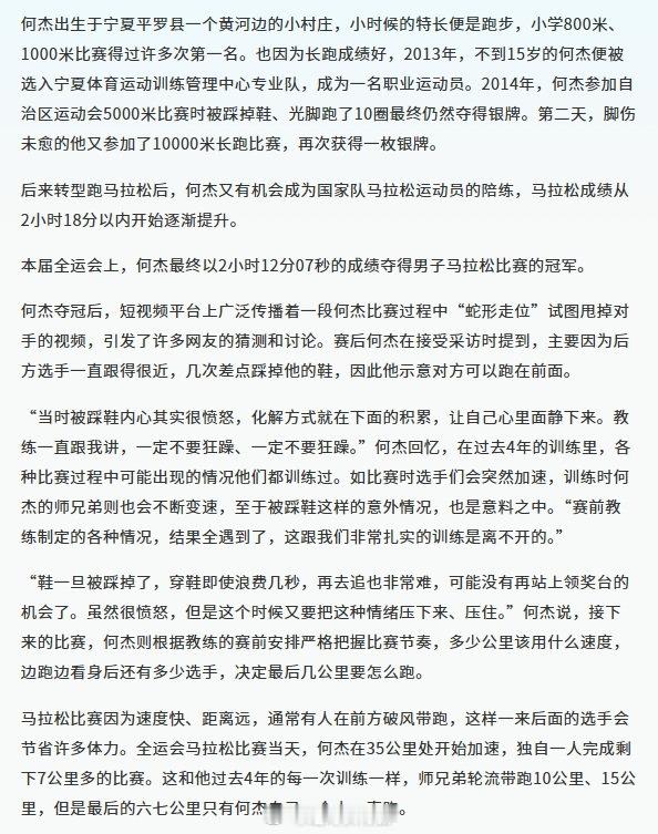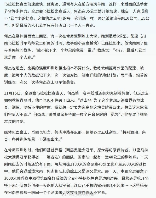 澎湃的《一枚全运会马拉松金牌的背后:何杰拼命奔跑的4年》是一篇很赞的关于田径运动员何杰的内容,推荐。一枚全运会马拉松金牌的背后 何杰拼命奔跑的4年 第十五届全运会