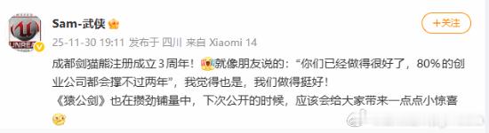 国产ARPG《猿公剑》制作人发文庆祝团队成立三周年11月30日,国产动作游戏《猿