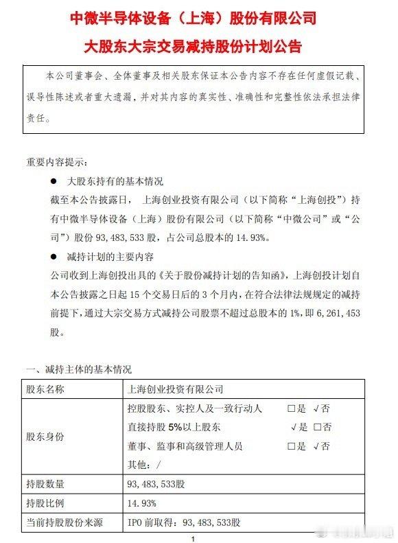 这A股减持潮是真没完没了啊!中微公司大股东上海创投要甩卖1%股份,626万股说扔