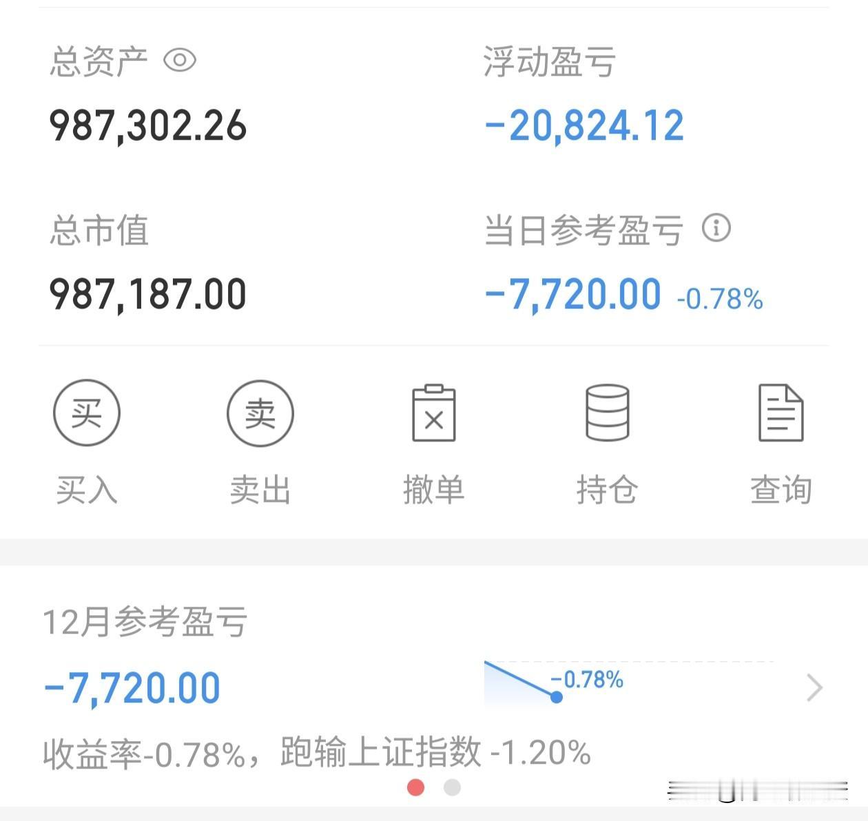 百万炒股日记第6天,中午收盘 12月的第一天,没有像大家一样普涨,等来的却是账户再创新低。 一碗大面7720。。。。。 全市场70%的个股都在上涨 而我们的软件+证券,暂且就这么耗着,都是绿的!!! 不想说话,中午睡一觉,看看下午是否有奇迹