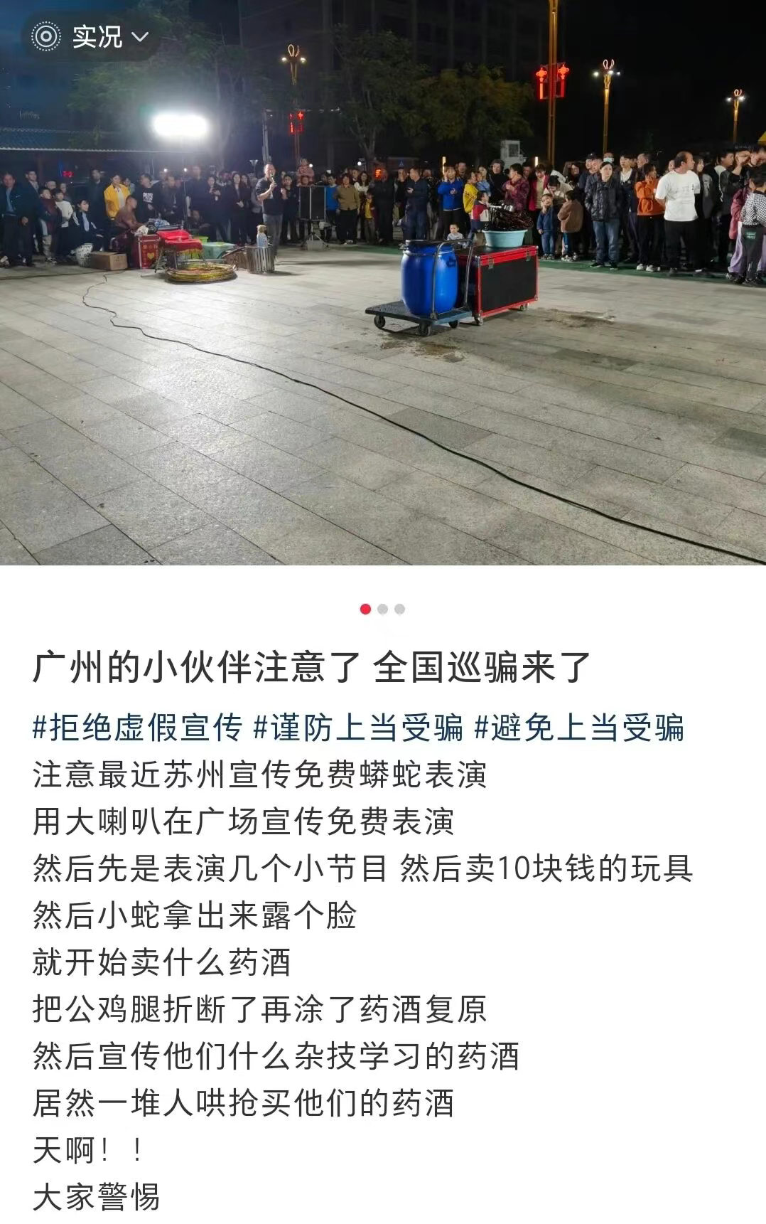 【广州多地近期出现马戏团骗局】最近广州白云区嘉禾、同德、金沙街等地出现了同个套路的骗局,那就是所谓的免费马戏团!他们这些基本上都是找到一些路边没人管的地方摆摊。名义上说是表演,当吸引众人围观后,这些人就开始卖药油了。卖了药油后,又扮可怜,让在场的观众捐款,说跟他一起表演的那个孩子,父母双亡,智商还有问题等等。