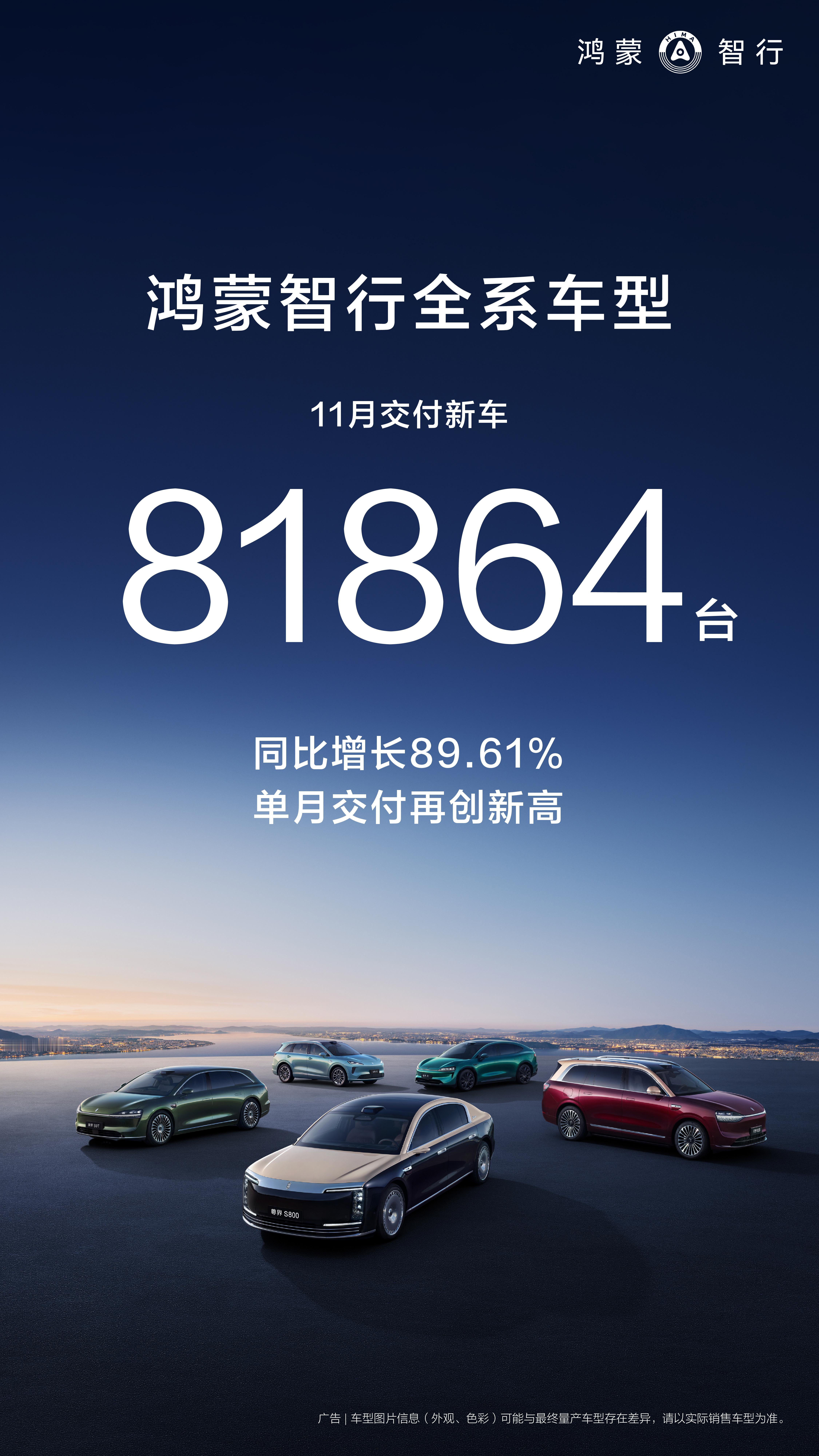 11月份鸿蒙智行全系车型交付81864台,再创新高!明显感觉几个界的销量都在稳中提升,月交付10万应该也不远了, 另外新车交付均价估计也是第一!