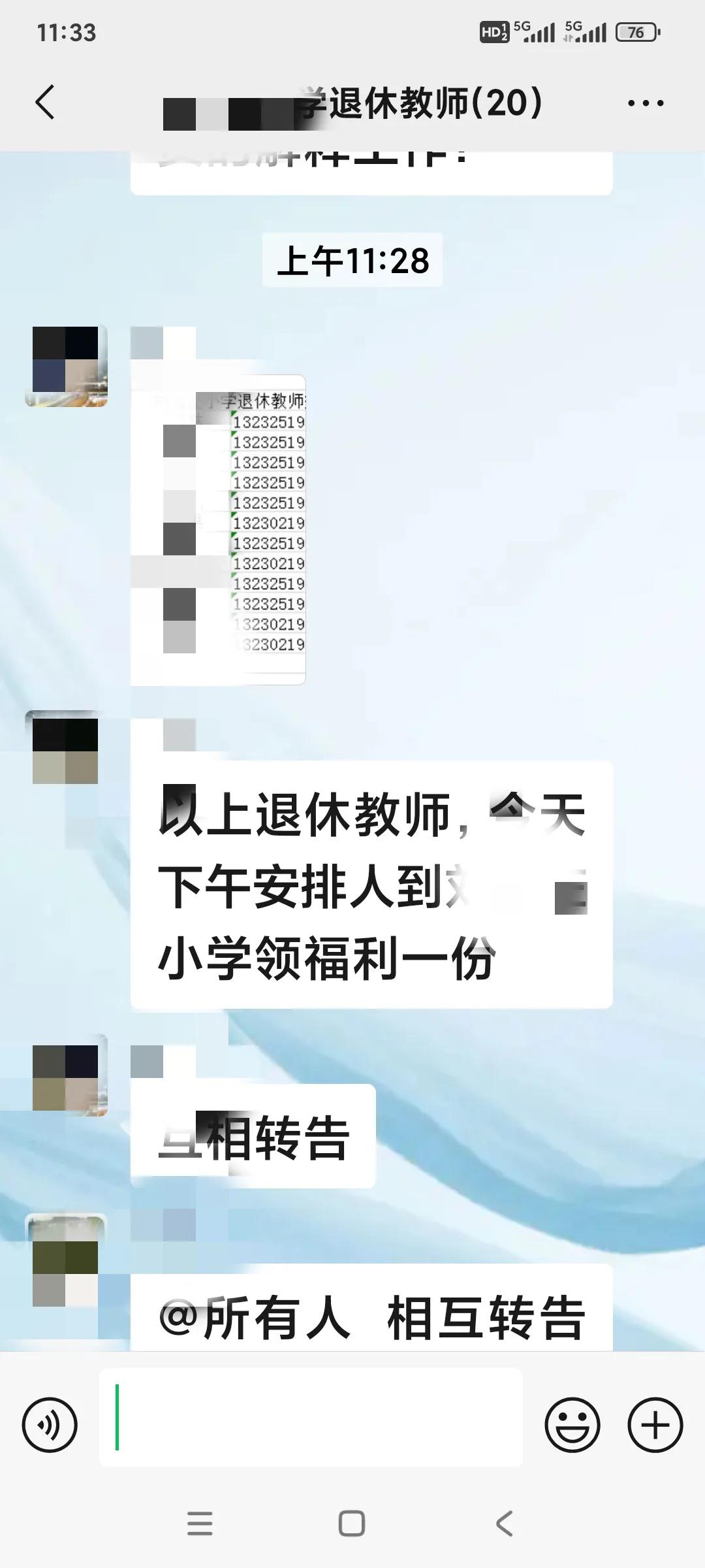 我于2024年2月退休,退休后既没了一年一次的体检,也没了任何福利。咱也能体谅,当下各级财政吃紧,该给的迟早会有,给不了的也没必要追问。 好消息!总务主任和校长都@我们了,年底福利来了?看看,学校并未将我们遗忘,随后,总务主任发了图片,是一袋小米和一壶熟炒花生油。 刹那间,心里暖烘烘的,原来学校还惦记着咱们这些退休老人。其实,我们在乎的并非那点福利,而是被人放在心上的那份踏实。 日子且行且过,总有些人记挂着你,多好。