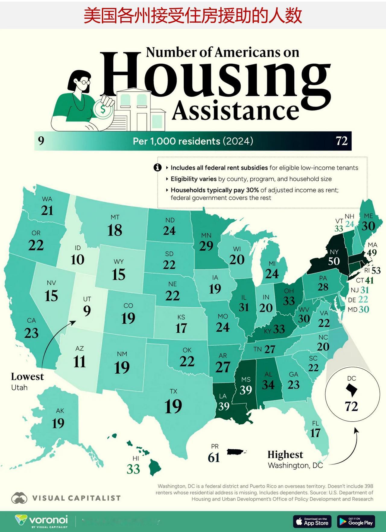 美国哪些州获得住房援助的比率高? 在美国许多地区,住房成本的增长速度远远快于工资增长速度,这给低收入人群带来了更大的经济压力。 下面图表展示了美国 50 个州、哥伦比亚特区以及波多黎各获得联邦住房援助的比例的情况,具体是根据低收入租房者获得联邦住房援助的数量与该地区总人口的比例来呈现的。数据来源于美国住房和城市发展部政策发展与研究办公室(HUD)。 政策发展与研究办公室 2024 年的估计显示,目前有超过 900 万美国人(每 1000 人中有 27 人)正在领取住房补贴、公共住房单元或其他形式的补贴。 家庭通常需支付其调整后收入(即扣除税款后的金额)的 30%作为租金,其余部分由政府承担。 ——各州需要租房援助的美国人情况统计 华盛顿哥伦比亚特区在这方面表现突出,每 1000 名居民中就有 72 名是受助租房者。 这一数字是美国平均水平(27 人)的两倍多,它反映了华盛顿特区高昂的住房成本、自 2000 年以来的人口增长情况,以及同期住房建设的有限增长。 波多黎各以每 1000 人 61 名的受助租房者位居第二——这是由于就业机会有限以及飓风过后重建工作的需求所致——而罗得岛则以每 1000 人 53 名的受助租房者位列前三。 一项研究发现,在罗得岛州,一名最低工资劳动者每周至少需要工作 85 个小时,才能负担得起一套标准的两居室公寓。 ——接受住房援助的美国人最少的州 美国大约一半的州每 1000 名居民中就有 20 至 30 名接受援助的租房者。 这一中间层次的地区包括中西部的一些州,如明尼苏达州(29 名)和密歇根州(24 名),还有快速发展的南部阳光地带的中心城市,比如佐治亚州(23名)。 在排名较低的地区,西部的爱达荷州(10 名)和犹他州(9 名)每 1000 名居民中的受助人数最少。这种差距的部分原因在于人口年轻化以及住房拥有率的提高。 但申请联邦租房补贴的资格因县而异,且还与家庭规模有关。数量较少的情况可能表明存在未得到满足的需求,或者意味着等待名单很长。 ——仅从绝对数字上看美国的住房援助情况 当不再以人均数据来衡量,而改为直接统计数量时,美国那些人口最多的州显然占据了主导地位。 单单纽约一地就为约一百万低收入租户提供了住房保障,这一数字大致相当于其他所有城市租户总数的总和。 加利福尼亚州紧随其后,有 919,000 人领取了此类福利,这反映出该州长期存在的经济负担问题。得克萨斯州(595,000 人)和佛罗里达州(405,000 人)的领取人数也相当多——尽管它们的人均领取率接近全国平均水平。