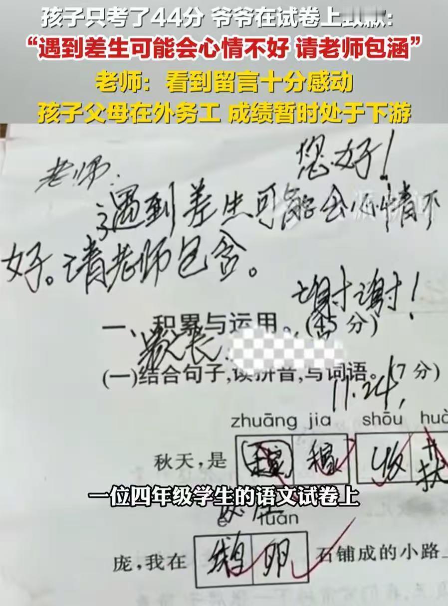 孩子考44分,爷爷试卷上的留言为何分外打动人?遇到差生可能会心情不好,请老师包涵。被指那2个字不应该出现。 好生都是相同的,差生各有各的不同。孩子考得不好,老人往往比孩子还自责。 这位爷爷能正视自家孩子身上的问题,真诚地向老师表达歉意和感谢。 凭我感觉,其实老师在一些基础相对薄弱的孩子身上花费的精力是挺多的。 差生孩子的家长往往对老师有误解,总觉得是老师的问题,对他们家的孩子没有尽心教。 要是有这样明理的家长,要是我,乐呵呵天天给孩子辅导,可现实中太多留孩子辅导还会被家长指责。 而这位爷爷的留言之所以打动老师,是因为他能正视自家孩子身上的问题,真诚地向老师表达歉意和感谢。 现实中,能这样体谅老师的家长真的很难得。 有人说爷爷不该写“差生”这两个字,其实“差生”的标签,在那一瞬间已换成了人心底最暖的光。