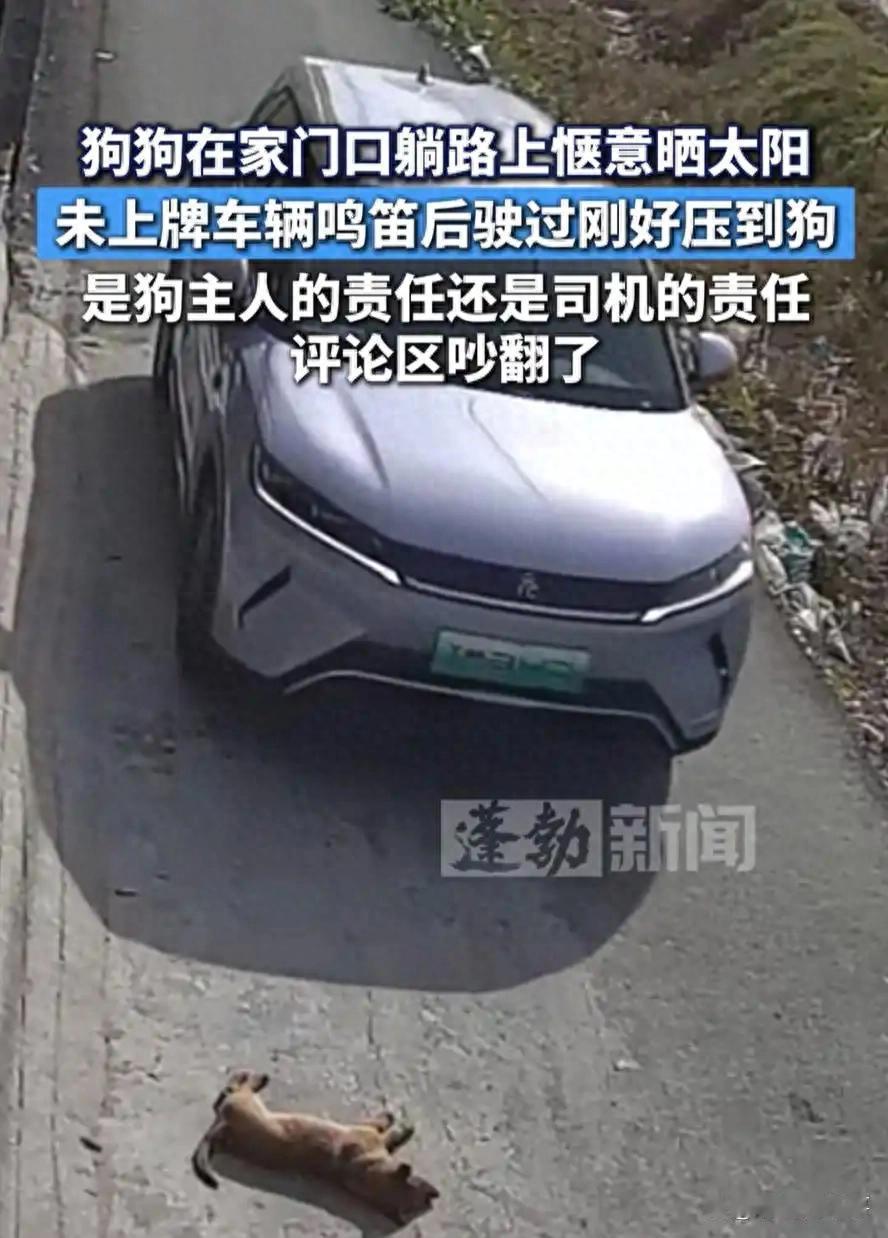 11月27日,浙江金华,狗狗躺路上晒太阳,不料,一辆未上牌车子驶来,鸣笛后见狗狗没让,竟然直接碾压了过去,狗狗吃痛狂吠不已,车主听到狗叫停了几秒,然后迅速驶离!等狗主人出来时,车子已经走远,到底是狗主人的责任,还是司机的责任?评论区吵翻了。[可爱] 一段来自浙江金华的行车记录仪视频,最近让很多网友看了心里不是滋味,视频里一条土狗正躺在自家门前的村道上晒太阳,一辆没挂车牌的SUV开了过来,司机按了喇叭,狗没动弹。 随后发生的事,成了争议的焦点,车子没有停下或绕行,而是从狗身上压了过去,听着狗狗的惨叫,车子停了几秒,司机没下车,接着就开走了,等主人跑出来,路上只剩尘土。 抛开情绪,我们平心而论,这事儿双方都难辞其咎,狗主人的责任是明摆着的,让宠物在公共道路自由活动,是对它的不负责,也给他人带来了风险。 但司机一方,问题同样扎眼,新车未挂牌就上路,首先就不合规,在村里这种随时可能有人、有动物穿出的地方,法律要求的是减速慢行、注意避让,按了喇叭不等于拿到了“通行证”,观察不清就往前开,是操作失误。 其实这种悲剧本可避免,常在乡村开车的老师傅都懂,遇到路上有动物,第一反应是收油减速,甚至停下来,轻轻按喇叭或示意它离开,这份耐心,是对生命的尊重,也是对自己最好的保护。 看完这个视频,心里真不是滋味,这件事在网络上引起了巨大争议,来看看大家是怎么说的。 “我就是跑运输的,说句公道话,司机鸣笛没错,但鸣笛不是‘开路符’!在农村路况,看见前头有猫有狗躺着,第一反应绝对是减速,在安全距离外停下。” “狗主人不拴绳,肯定要负主要责任,这是事件的起因,但司机的问题也很大,第一未悬挂牌照上路,先违法了,第二在居民区未尽到充分的观察和避让义务,第三事发后未下车处理并驶离,如果狗的价值较高,可能构成交通肇事逃逸。” “哎哟看得我心疼死了!在我们农村,狗在门口路上晒太阳太常见了,路是大家的,但开车的眼里就得能容下这些活物。” “大家都冷静点,别光喷司机,我仔细看了视频,司机鸣笛后有个明显停顿,他可能真的以为狗会走开,或者存在视觉盲区误判了。” “我有过类似经历!晚上在乡道开车,远远看见一团黑影,我以为是塑料袋就没在意,近了一看是条黑狗,赶紧刹车但还是蹭到了,吓得我一身冷汗,立马双闪,下车查看,联系主人,赔钱道歉。” “作为养狗人,看到这种新闻心情复杂,我出门必定牵绳,因为我知道不是所有人都喜欢狗,马路上更是危险,视频里的主人但凡有一点责任心,狗也不会遭这个罪,司机行为固然可气,但狗主人是第一责任人。” 如果当时你在现场,是那名司机,在鸣笛后狗依然没动,你会怎么做?是选择耐心等待、下车驱赶,还是认为路权优先,直接开过去? 期待你在评论区留下真实的想法。 信源:蓬勃新闻