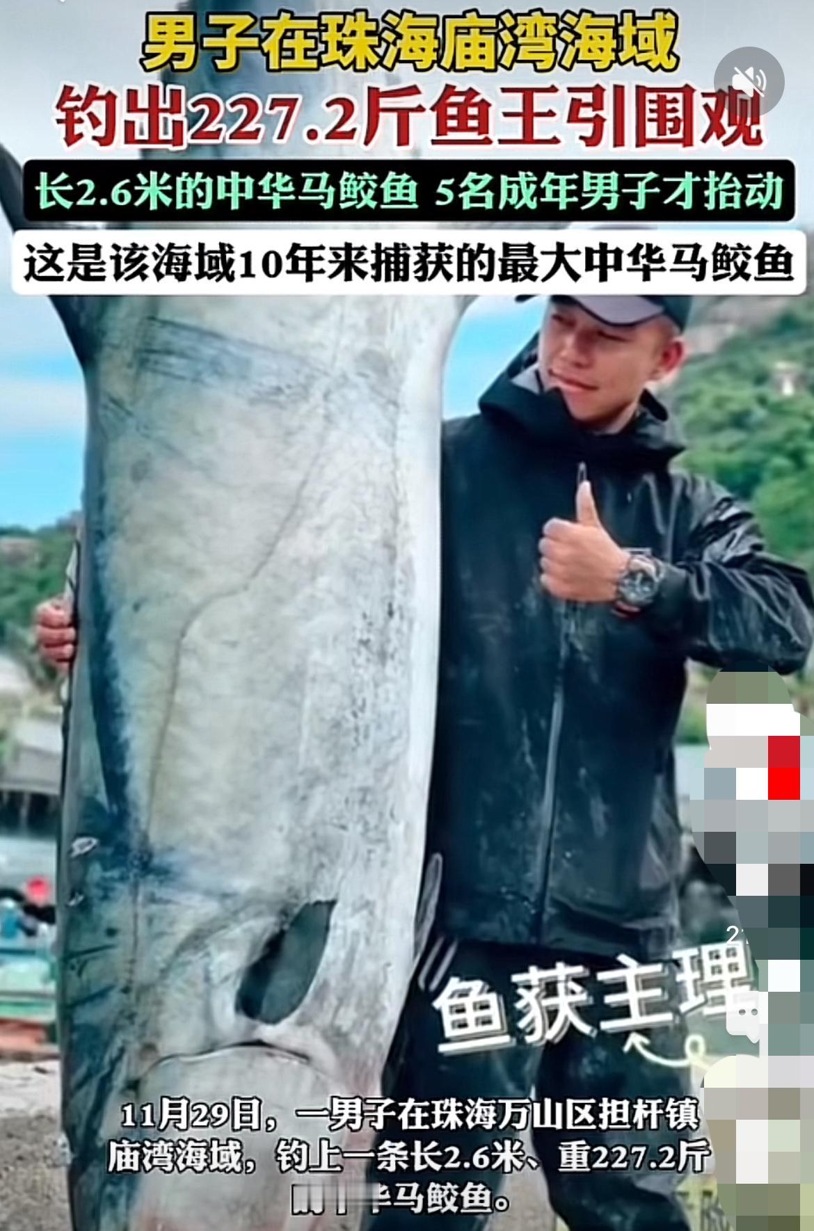 男子钓出227.2斤鱼王引围观! “你信吗?在珠海海钓,五个大男人差点抬不动一条鱼!” “是真的啊!五个壮汉才抬得动!珠海这片海出了条227斤的‘鱼王’。” 2025年11月29日,在广东珠海,万山区担杆镇的庙湾海域,一名男子在垂钓时,经历了一场长达近两小时的搏斗,最终将一条罕见的巨型中华马鲛鱼拖出水面。 这条鱼一经出水,立刻引发了现场大批游客和渔民的惊叹与围观。经测量,其体长达2.6米,重量更是达到了惊人的227.2斤。由于体型巨大,单凭一人之力根本无法挪动,最终需要五名成年男子齐心协力,才将其抬离海面。 据当地渔民介绍,这是庙湾海域近十年来捕获的最大一条中华马鲛鱼,这样的规格在周边海域也极为罕见。目前,这条被称为“海中巨物”的鱼王,已被妥善安置在担杆镇外伶仃岛的冷库里,等待后续处置。 对于这条“鱼王”的命运,大家是站“放生派”还是“科普派”?或者你有更妙的点子?别藏着掖着,评论区等你来掰扯掰扯! [免责声明]文章的时间、过程、图片均来自于网络,文章旨在传播正能量,均无低俗等不良引导,请观众理性看待本事件,切勿留下主观臆断的恶意评论,互联网不是法外之地。本文如若真实性存在争议、事件版权或图片侵权问题,请及时联系作者,我们将予以删除。
