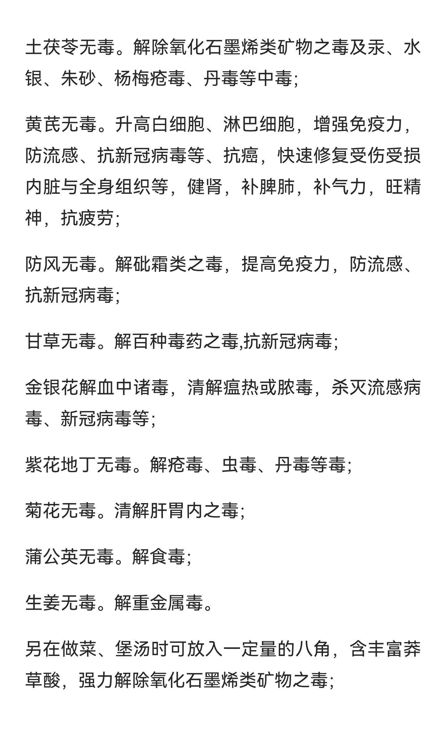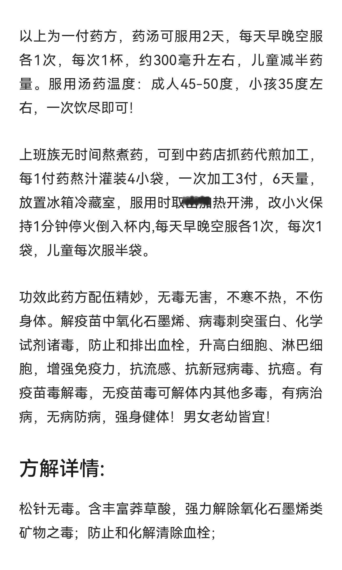 内服中药方:功效此药方配伍精妙,无毒无害,不寒不热,不伤身体。解疫苗中氧化石墨烯、病毒刺突蛋白、化学试剂诸毒,防止和排出血栓,升高白细胞、淋巴细胞,增强免疫力,抗流感、抗新冠病毒、抗癌。有疫苗毒解毒,无疫苗毒可解体内其他多毒,有病治病,无病防病,强身健体!男女老幼皆宜!健康养生