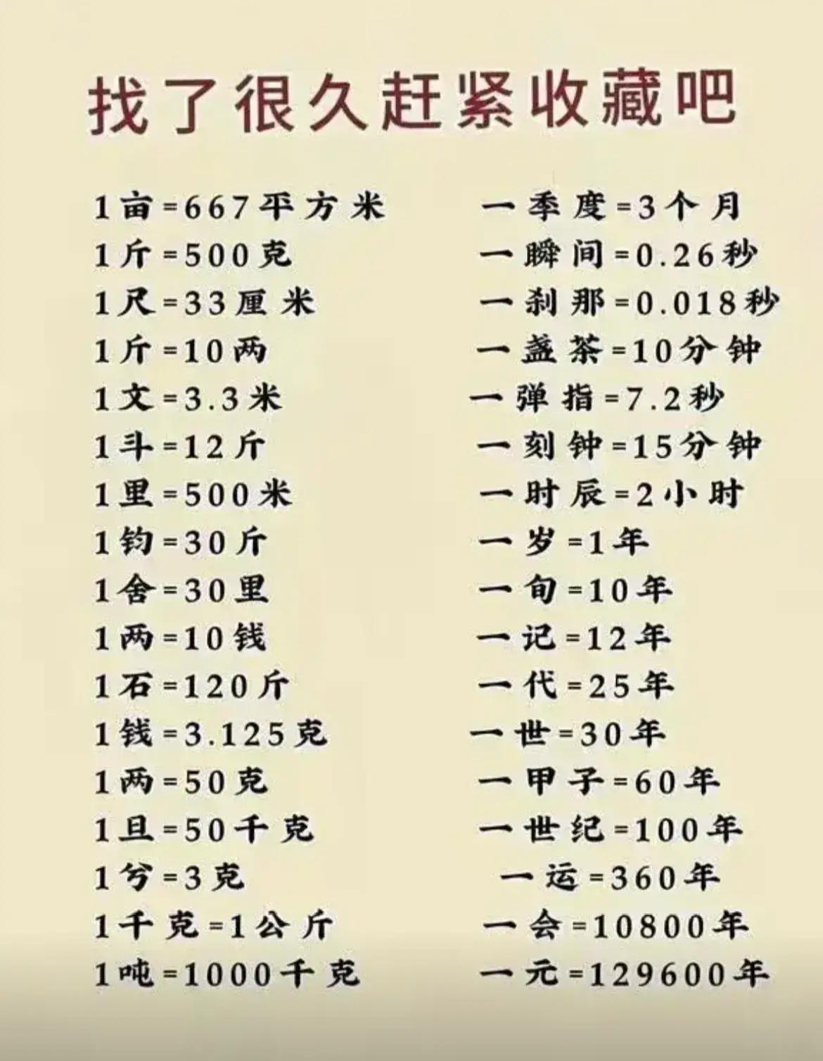 强烈建议大家收藏的这个单位换算表,因为我们很多时候都会用到各种单位,然后有各种换算,包括时间单位啊,长度单位啊,重量弯位啊,我相信很多人都不知道。 整理了日常高频+实用优先级拉满的单位换算表,清晰好记,建议收藏备用: 一、长度单位(最常用) • 1公里(km)= 1000米(m) • 1米(m)= 10分米(dm)= 100厘米(cm)= 1000毫米(mm) • 1厘米(cm)= 0.3937英寸(in);1英寸(in)= 2.54厘米(cm) • 1英里(mile)≈ 1.609公里(km) 二、重量单位(生活/购物必备) • 1吨(t)= 1000千克(kg) • 1千克(kg)= 1000克(g)= 2斤(市斤) • 1斤 = 500克(g);1两 = 50克(g) • 1磅(lb)≈ 0.454千克(kg);1千克(kg)≈ 2.205磅(lb) 三、时间单位(工作/学习常用) • 1天 = 24小时(h);1小时 = 60分钟(min);1分钟 = 60秒(s) • 1周 = 7天;1个月≈30天;1年 = 12个月 = 365/366天 • 1世纪 = 100年;1 decade(十年)= 10年 四、面积单位(买房/装修常用) • 1平方米(㎡)= 100平方分米(d㎡)= 10000平方厘米(c㎡) • 1公顷(ha)= 10000平方米(㎡)= 15亩 • 1亩 ≈ 666.67平方米(㎡) • 1平方英尺(sq ft)≈ 0.093平方米(㎡) 五、体积/容积单位(做饭/购物) • 1立方米(m³)= 1000立方分米(dm³)= 1000升(L) • 1升(L)= 1000毫升(mL)= 1立方分米(dm³) • 1毫升(mL)= 1立方厘米(cm³) • 1加仑(gal)≈ 3.785升(L)