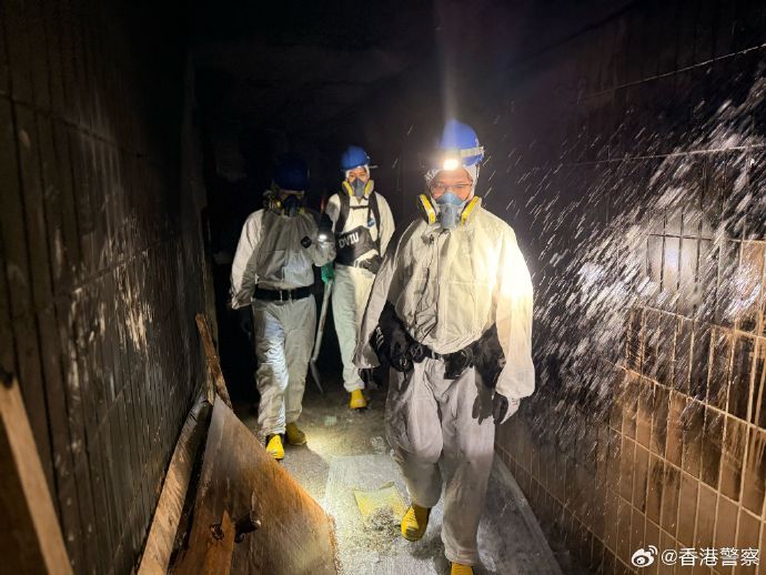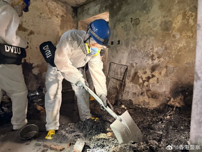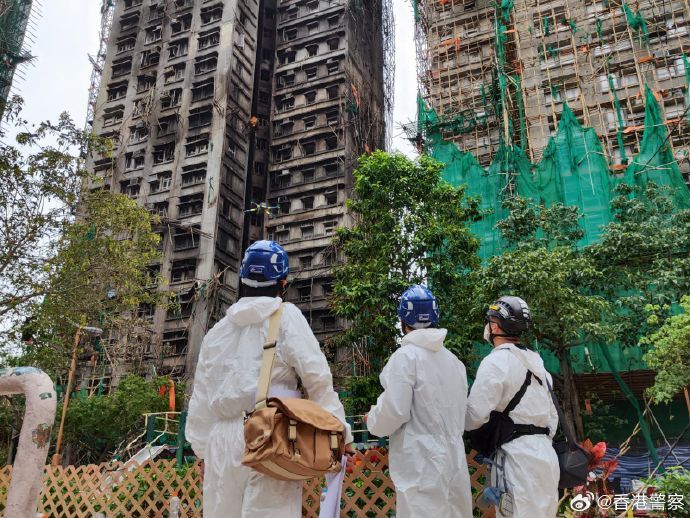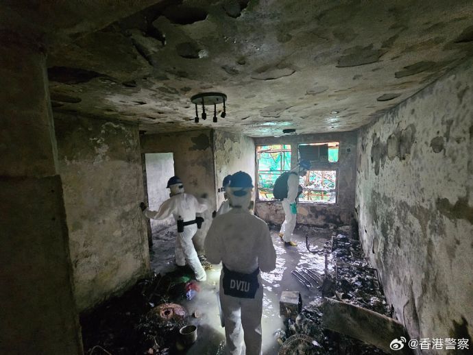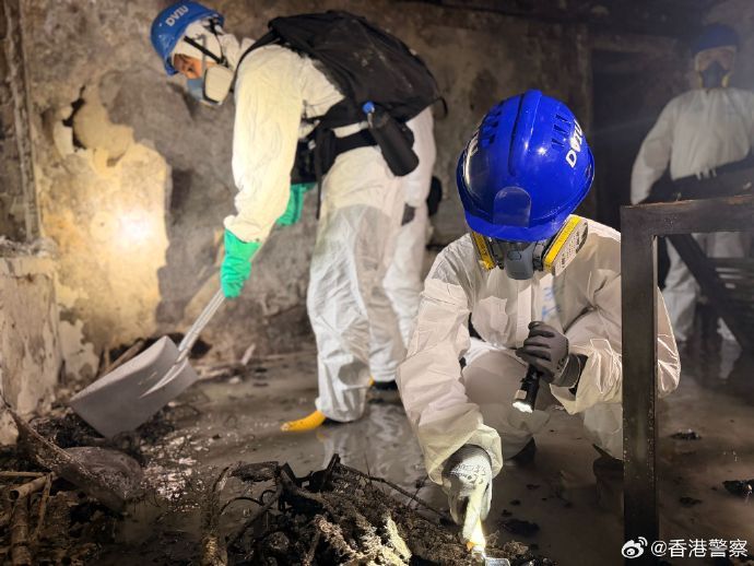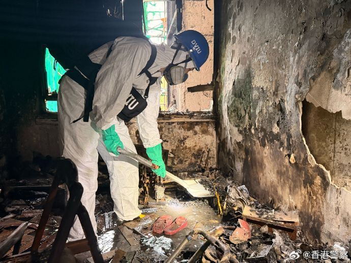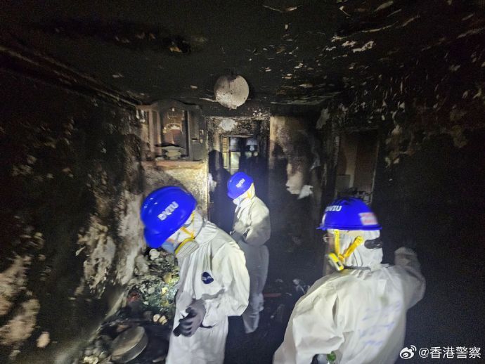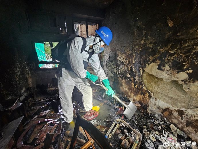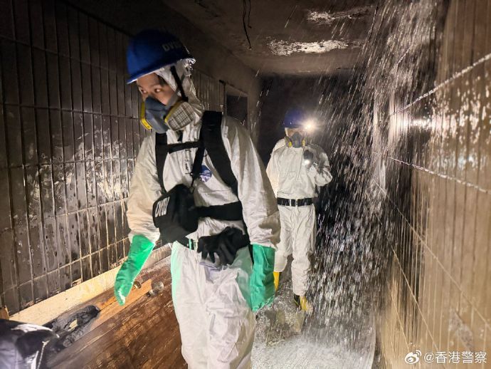 #香港火灾楼内情况# 香港警方灾难遇害者辨认组、鉴证科及其他人员全速投入工作,包括案件搜证、灾场搜索、遗体辨认及登记等。经火灾后,现场环境恶劣,外围有烧毁的竹枝及冷气机等物品,而大厦内漆黑一片,部份单位水深及小腿,亦有大量家具杂物倒塌。人员仍无畏无惧,团结一致,于现场尽全力搜索能够辨认到、确认到遇难者身份的任何物件或线索,让遇难者的家人可以尽早确认他们的身份,让逝者安息(来源:香港警察)