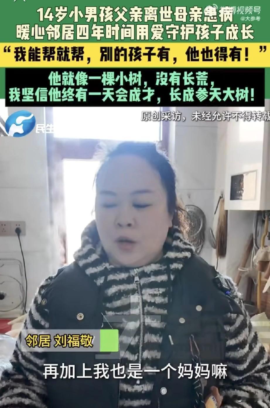 “邻里真情!”河南郑州,14岁男孩父亲早年离世,母亲又身患重病,因此他的生活陷入困境,幸运的是,邻居刘女士得知后,毫不犹豫的伸出了援手,默默照顾了他整整四年,刘女士把男孩当成自己的孩子,每天送去热菜热饭,还关心他的学习,跑前跑后的帮他联系学校,说:“别的孩子有的你也得有”,刘女士这份毫无保留的爱也滋养了懂事的小男孩,他格外争气,转学一个学期考试就取得了年级第一,他还懂事的说自己长大后也要去帮助更多的人! 我觉得邻居妈妈的真情一定会照亮男孩的前程,为他们点赞!