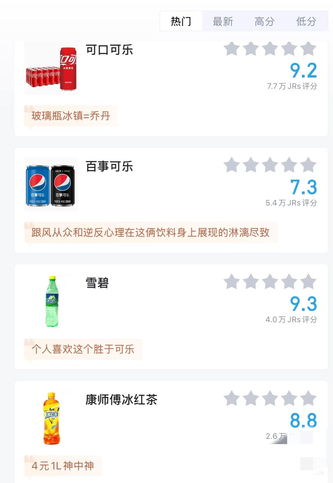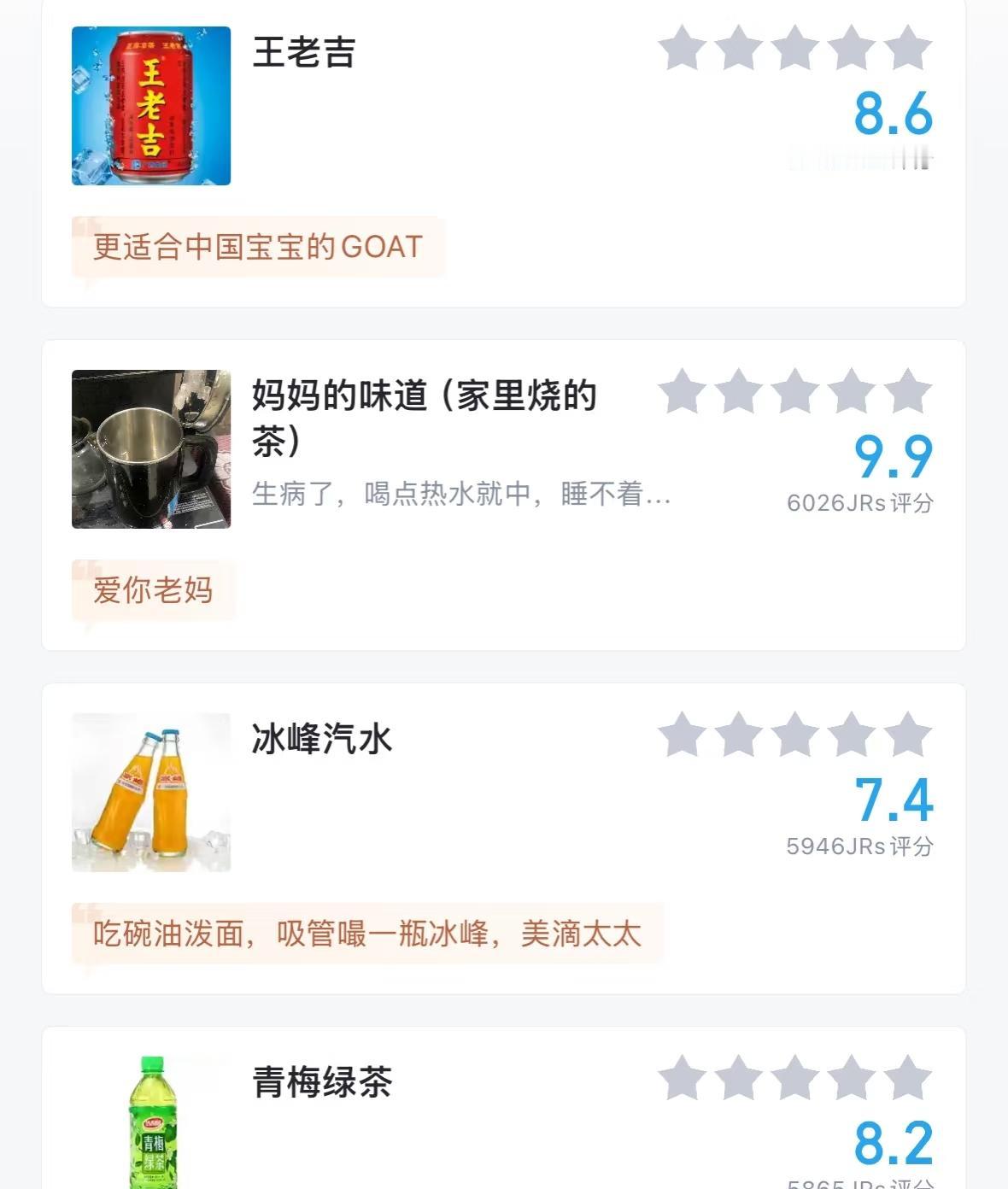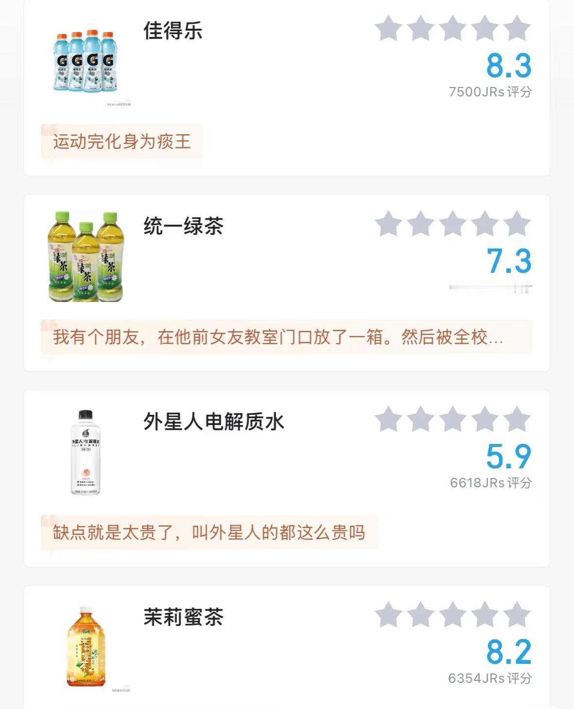 某知名网站饮料排名打分,大家可以看下,跟你的口味是不是差不多。 反正更我的差不多。 分数最高的是水,9.8分。 其他可口可乐、雪碧分数也挺高,不过雪碧那个甜味我不喜欢。 没想到的是AD钙奶分数这么高,达到了9.4分。