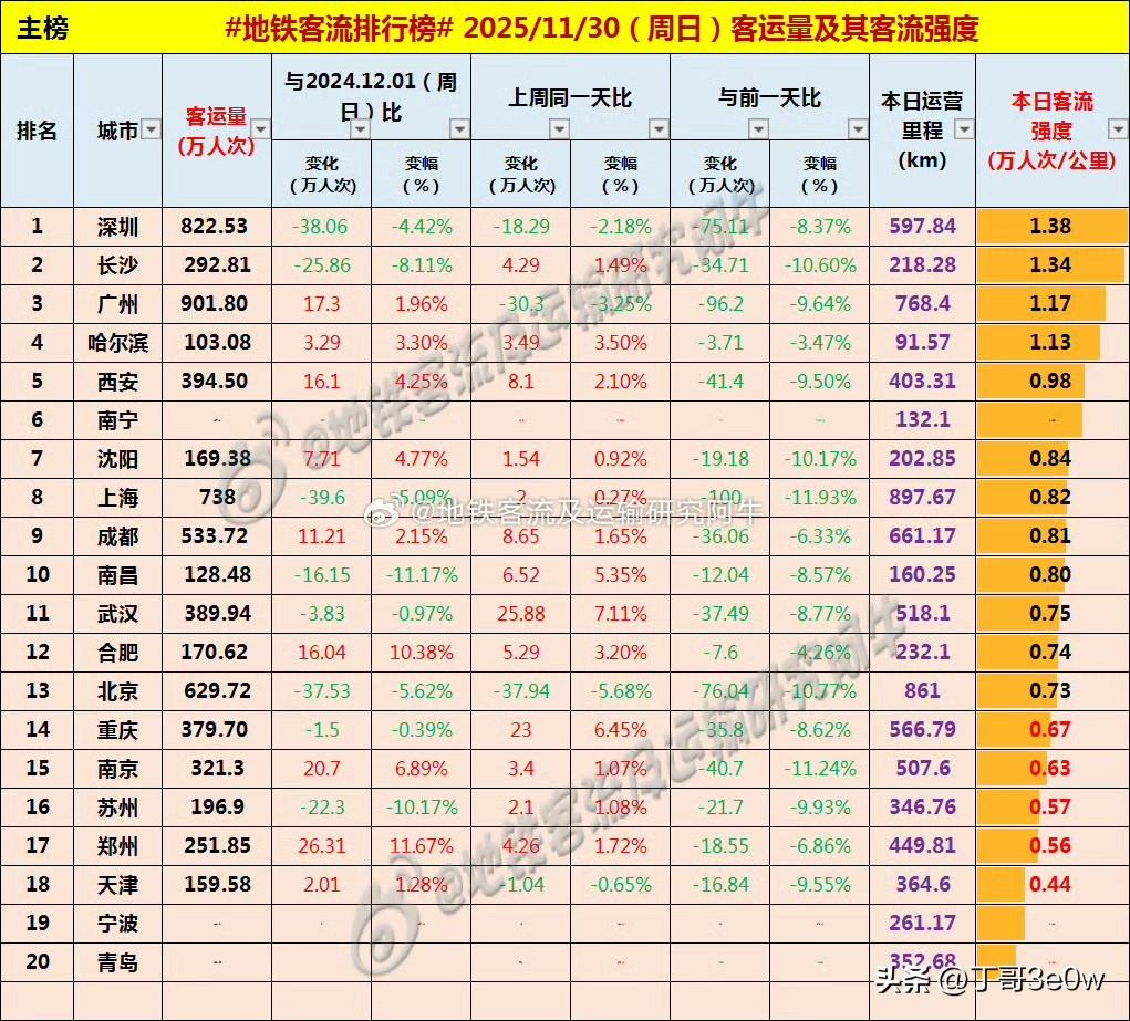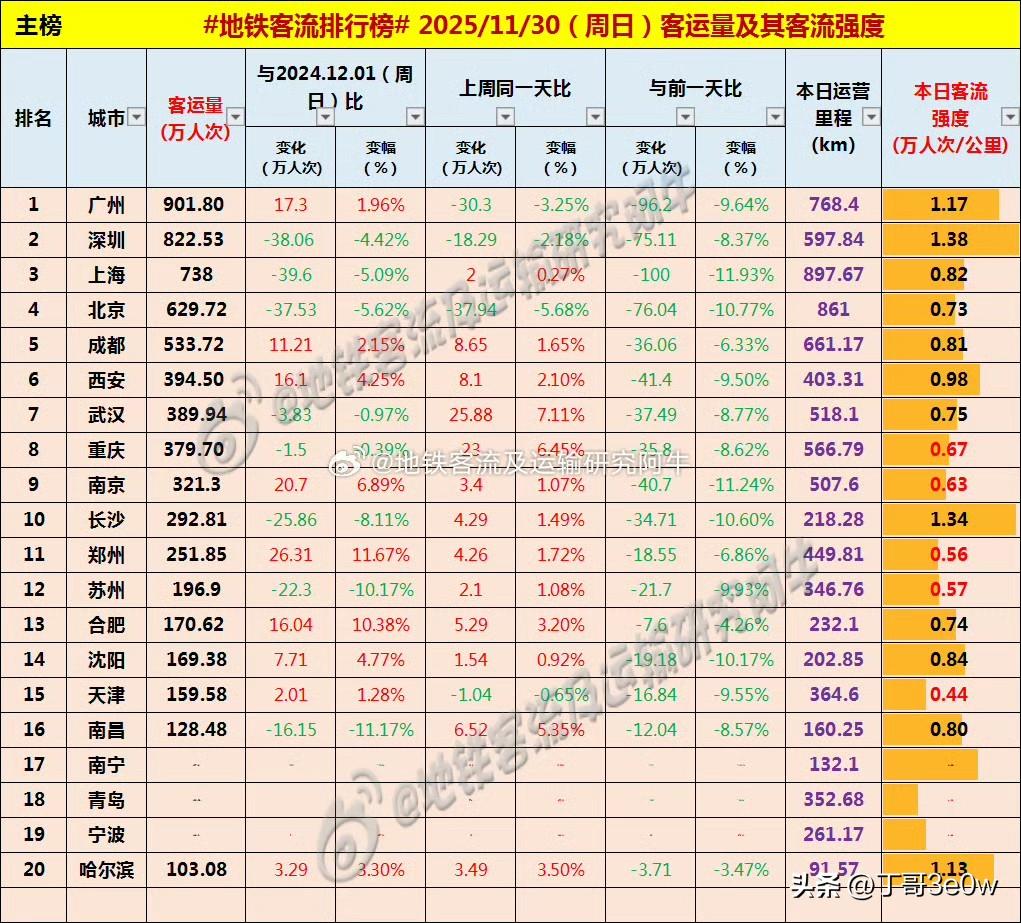 11月最后一天合肥地铁客流量达170万人次以上超过了沈阳[呲牙][呲牙][呲牙] 爆料 身边事 排行榜 周日 中国地铁客流日报 合肥地铁 沈阳地铁 2025年11月30日 星期天 全国重点城市轨道交通客流量排行榜: 广州:901.80万广州地铁 深圳:822.53万深圳地铁 上海:738.00万 北京:629.72万 成都:533.72万 西安:394.50万西安身边事 武汉:389.94万武汉地铁 重庆:379.70万重庆地铁 南京:321.30万南京地铁 长沙:292.81万长沙身边事 郑州:251.85万郑州爆料 苏州:196.90万 合肥:170.62万合肥身边事 沈阳:169.38万 南昌:128.48万 南宁:100万+南宁身边事 青岛:100万+青岛爆料 宁波:100万+宁波地铁 哈尔滨103.08万