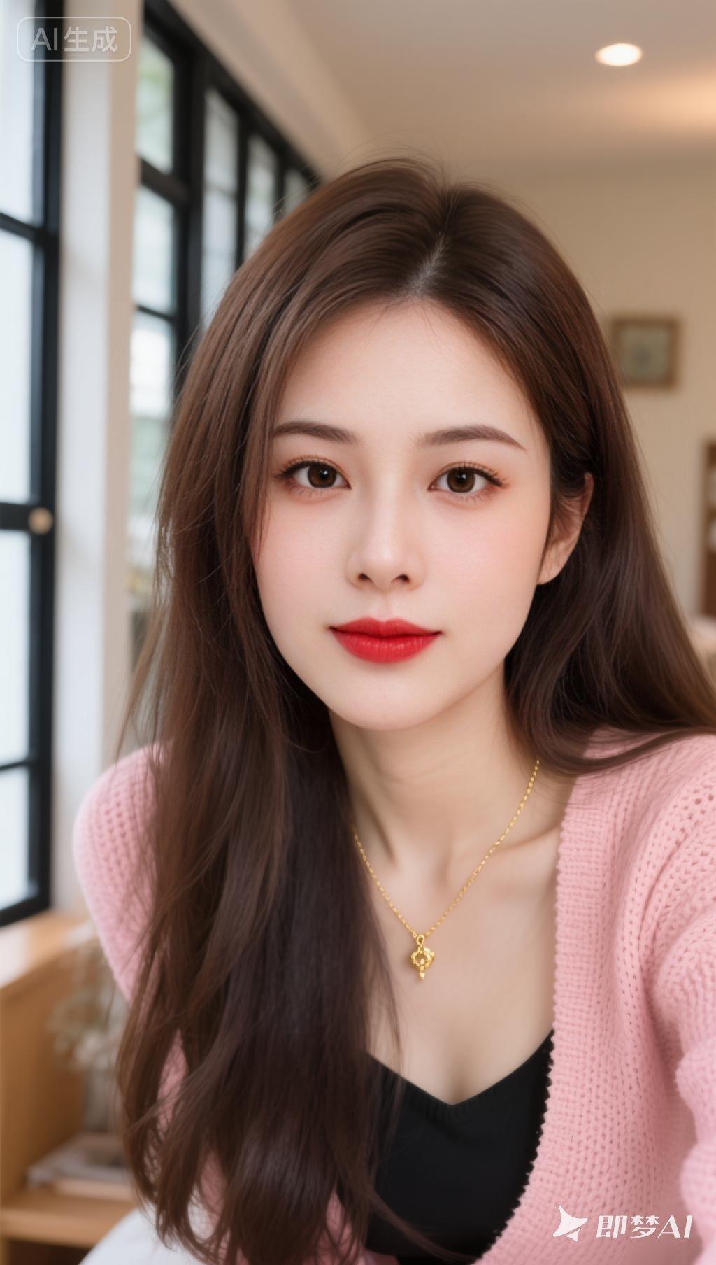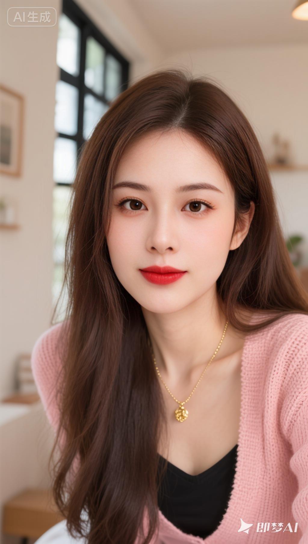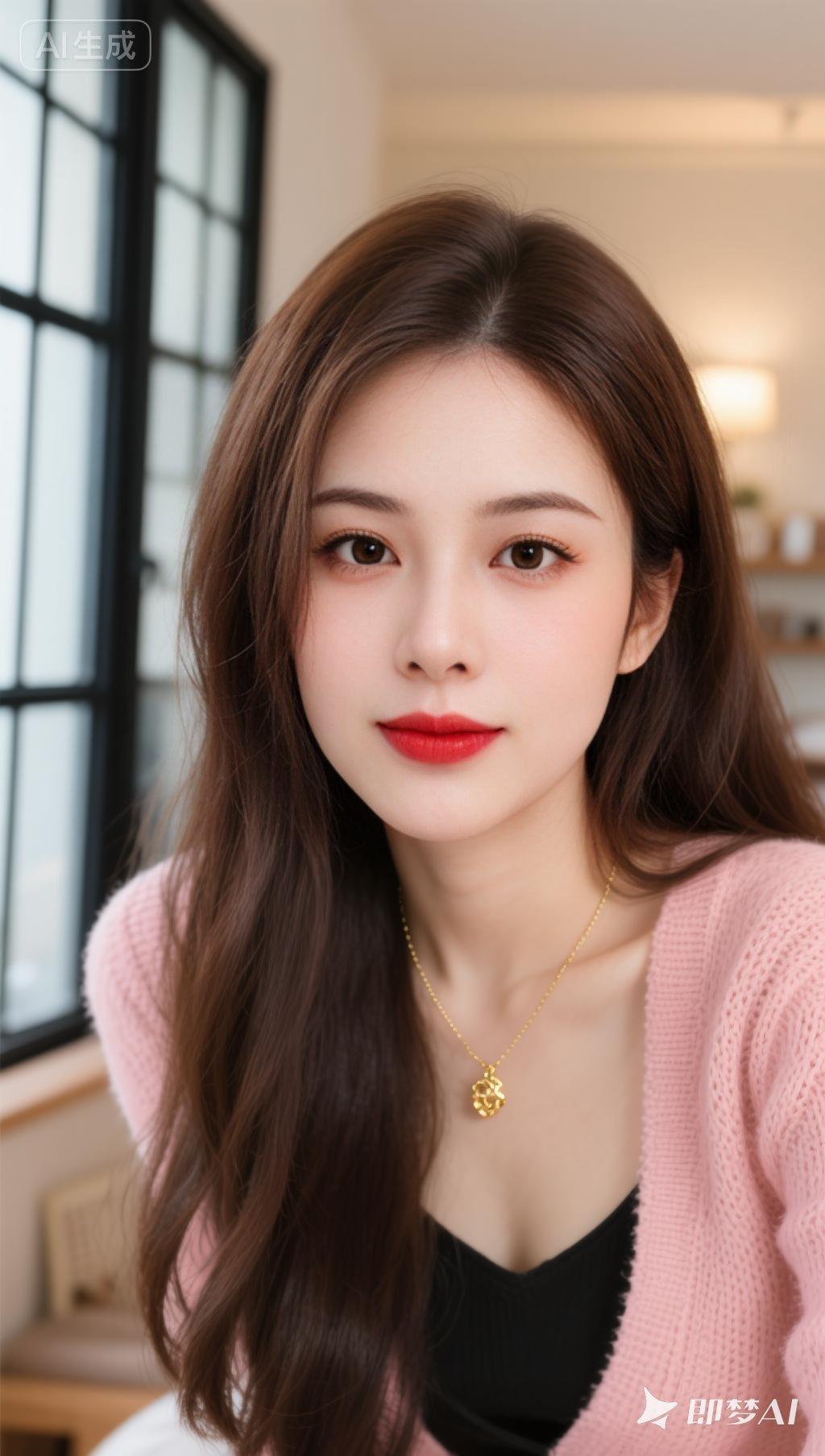 一位东亚风格的年轻女性,有着一头自然垂落的深棕色长发,发丝柔顺且有轻微的蓬松感。她的眼睛是棕褐色,明亮且有神,眼妆精致自然,搭配着珊瑚色的口红,呈现出温柔甜美的妆容。她身着一件粉色的针织开衫,内搭黑色衣物,脖颈间佩戴着一条金色项链
