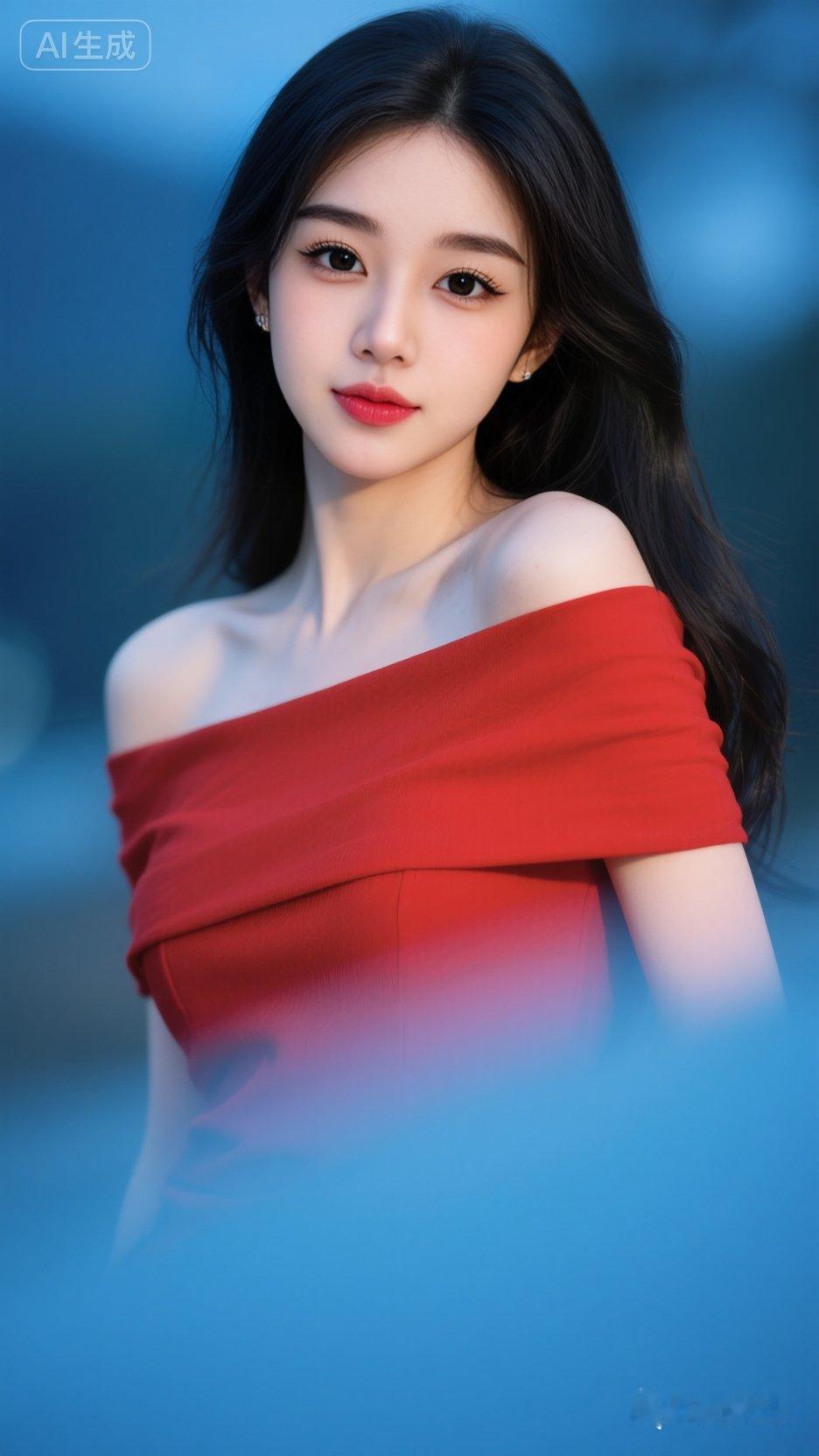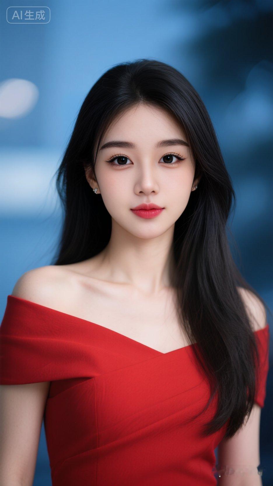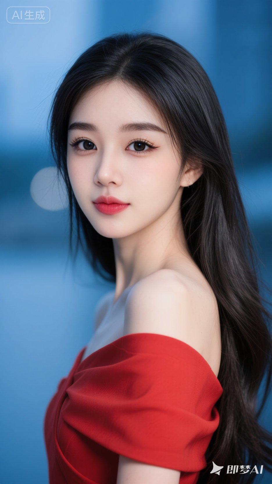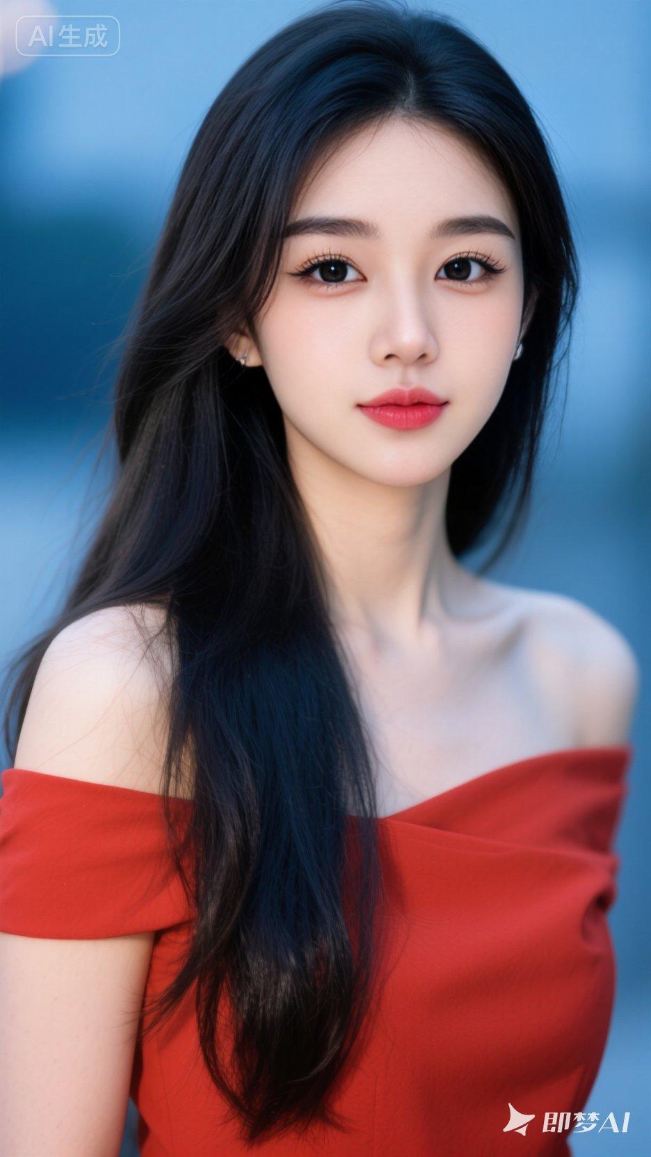 一头乌黑亮泽的长直发自然垂落,几缕发丝被微风轻扬起;妆容清透细腻,杏眼衬着纤长卷