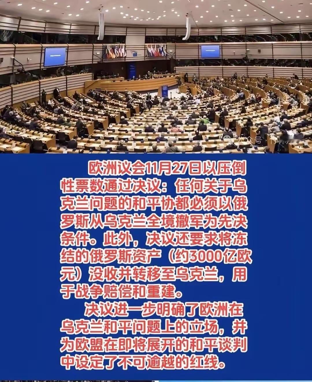欧洲议会以俄罗斯必须从乌克兰全境撤军为和谈先决条件,意味着俄罗斯只有将战争进行到底了。 欧洲议会11月27日以619赞成,12票反对,43票弃权获得压倒性多数通过决议:任何关于乌克兰问题的和平协议都必须以俄罗斯斯从乌克兰全境撤军为先决条件。此外,决议还要求将冻结的俄罗斯资产(约3000亿欧元)没收并转移至乌克兰,用于战争赔偿和重建。 在现在这种情况下,乌克兰在俄乌冲突停战和谈问题上将做如何选择是最关键的因素。是听欧洲的呢?还是听美国的?还是自己可以做主? 其实,如果乌克兰是听美国的28条和谈内容,那么还有可能与俄罗斯达成停战协议。如果听欧洲的那么按照现在欧洲议会通过的决议条件看,俄罗斯极有可能只有唯一的选择,那就是将战争进行到底。然而,有一点可以肯定,俄罗斯是绝不可能通过牺牲十几万俄军才占领的乌克兰领土,会轻易放弃。
