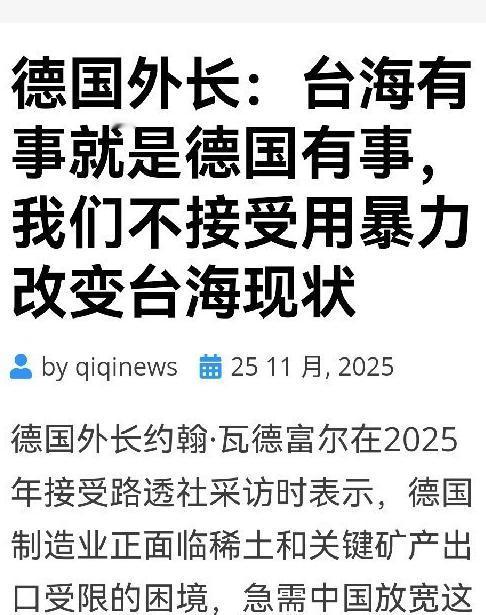 台湾有事就是德国有事?果然法西斯国家都是同气连枝。日前,德国外长瓦德富尔在接受路透社的采访时表示,虽然德国坚持一个中国政策,但绝不容忍任何通过暴力手段改变现状的行为。 最近德国外长瓦德富尔的一句话挺惹眼,说“台海有事就是德国有事”,还在路透社采访里提坚持一个中国政策,却反对“暴力改变现状”。 这话听着矛盾,得先说说这人到底是谁。 瓦德富尔今年62岁,早年学法律当律师,上世纪八十年代就进了基民盟,从州党部一路做到联邦议院议员,2025年5月刚当上外长,是近60年基民盟出的首位外长。 他在政坛一直是“大西洋主义者”,主张抱紧北约,还力挺给乌克兰加码军援,对中国向来持强硬态度。 他这套言论不是突然冒出来的,10月在柏林演讲时就把台海和德国绑在一起,还喊着要日欧联手对付中俄。 更讽刺的是,当时他都定好要访华了,却连着在日本和德国国内炒作台湾问题,结果中方没安排会谈,访华行程直接黄了,德媒都骂这是“超级外交灾难”。 这么做其实藏着几层心思,从他的立场看,身为基民盟核心成员,深化北约整合是他的政治主张,跟美国、日本唱和涉台议题,能巩固他在党内和北约的话语权。 但他明显没算清经济账,2025年1到8月中德贸易额都1634亿欧元了,中国早是德国最大贸易伙伴,德国汽车业、半导体产业缺的稀土,八成以上都靠中国供应链。 说白了,他是想两头讨好,一边拿涉台问题刷“价值观外交”存在感,一边还想求中国放宽稀土管控。 可他忘了台湾是中国内政,中方早挑明了,只说“维护现状”不提反“台独”,就是纵容分裂。 德国内部都有人看不过去,社民党议员直言他在破坏中德关系。 他的误判在于高估了德国的议价权,以为能靠施压让中国妥协。 却没想过,现在德国经济已经停滞三年,美国又在加征关税,中国市场是关键支撑,这种“又要好处又踩红线”的做法,最后只能是自断后路。 以上都是个人观点,对此您有什么不同的看法,可以在评论区留言讨论!!!