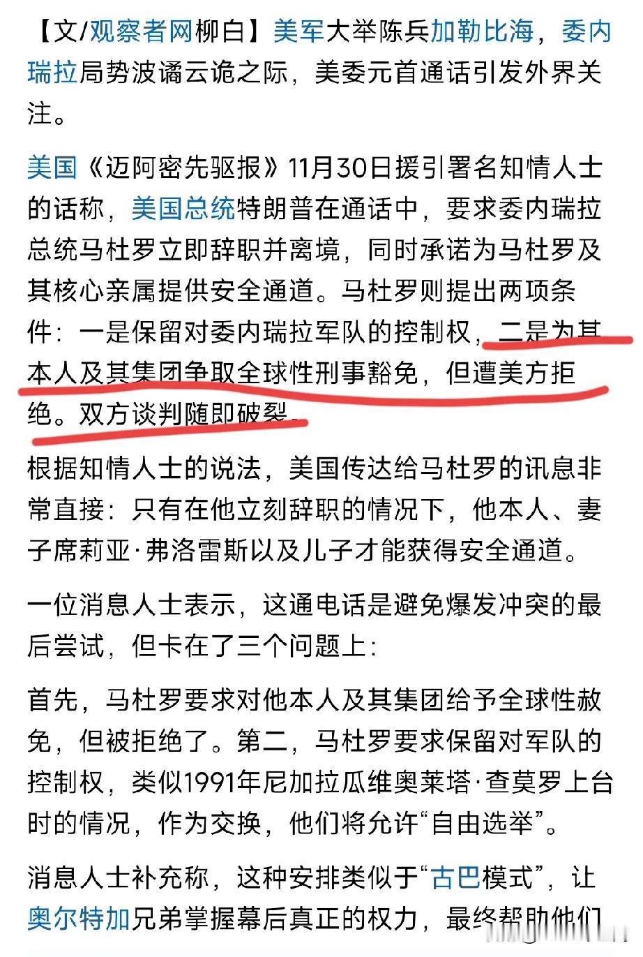 怪不得美国要打击委内瑞拉毒贩! 马杜罗竟然在与特朗普的通话中要求获得“本人及其集团的全球刑事豁免权”: 也就是说委内瑞拉毒贩或与委内瑞拉政府真的有瓜葛。 否则,马杜罗怎么会要求特朗普对其进行“全球刑事豁免”。 特朗普最反感毒贩,所以委内瑞拉问题会越发严重……