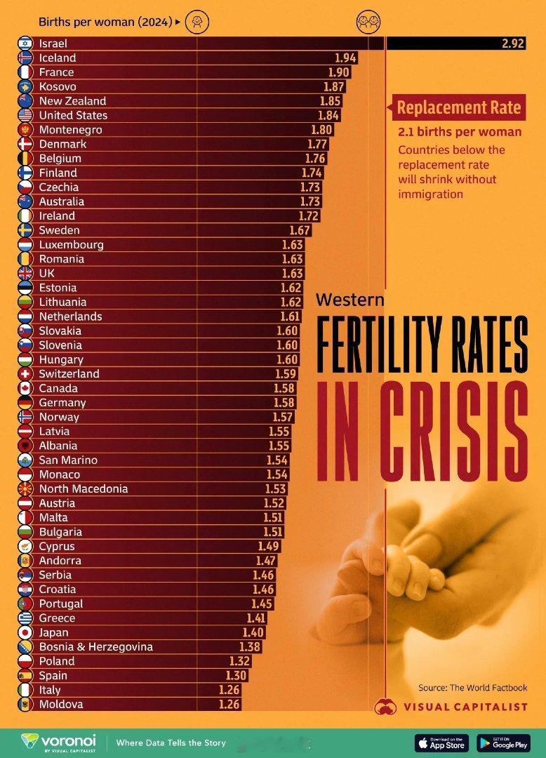 西方人口萎缩的未来📉 人口更替率是每名妇女生育2.1个孩子。低于人口更替率的国家,如果没有移民,人口将会萎缩。以下图表中每名妇女生育子女数(2024 年)数据可视化人口老常政经常涤非超话常涤非观点
